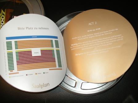 Прерву на минуту обзор работ. Поговорим о тех самых деталях, которые сопровождали церемонию. При регистрации (напомню, вручение наград проходило в мультиплексе) всем гостям выдавали металлическую коробку. Но не с пленкой нового фильма. Внутри – подробно расписанная программа церемонии (вплоть до телефонов вызова такси и полиции, поскольку самые стойкие до четырех утра могли плясать на дискотеке). На одной из страниц – схема зала с указанием, где следует садиться номинантам, где – гостям и прессе. Еще – на руку надевался пластмассовый ремешок соответствующей окраски, он же служил затем пропуском на банкет.