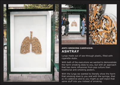Еще раз посмотрев на легкие-урну, я подумал, что у немцев идея воплощена все-таки сильнее – она интерактивна, зрителя вовлекают в коммуникацию. Прохожие не просто ужасаются при виде забитых легких, как у финнов, сделавших из окурков инсталляцию на автобусной остановке (их работа – на снимке), а в данном случае имеют «счастливую» возможность лично пополнить эту страшную никотиновую копилку. Если, конечно, при виде такой урны рука потянется к сигаретам…