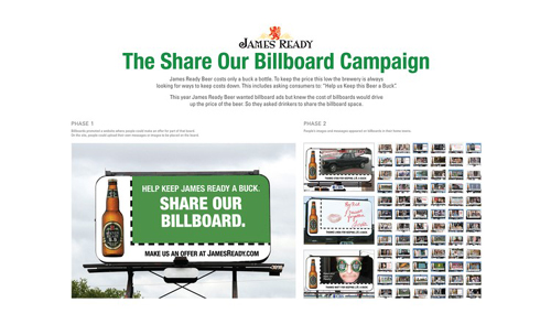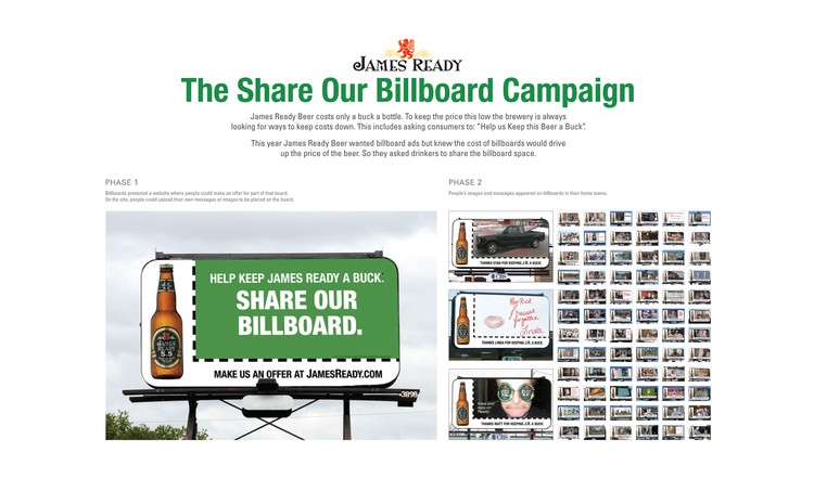 Share Our Billboard Campaign (Campaign) James Ready Advertising Agency: Leo Burnett, Toronto Creative Director: Israel Diaz, Paul Giannetta, Sean Barlow Art Director: Anthony Chelvanathan, Paul Giannetta Copywriter: Steve Persico, Sean Barlow Global Downturn Financial Times DDB London, London Media