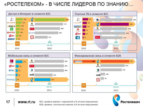 «Если показать респондентам наш фирменный знак - «ухо», треть из них без подсказок однозначно говорит, что это - Ростелеком. А на вопрос, знают ли они о бренде «Ростелеком», утвердительно отвечает более 80% респондентов. Я рассчитываю, что в следующем году мы выйдем на уровень 60% спонтанного узнавания и 90% знания с подсказкой», - отметил г-н Лёвочка.