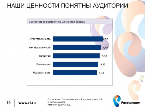 «Мы планируем установить целевые показатели по всем параметрам восприятия бренда на будущий год и на пять лет вперед, исходя из стартового уровня восприятия нашего бренда всеми типами аудиторий, который мы получили. Также в наших планах более тесная интеграция бренда и его философии в операционную деятельность компании, например, в диалог оператора call-центра с клиентом или инсталлятора, пришедшего подключать нашего потребителя. И не только на уровне взаимоотношений с клиентами, но и во внутренних операционных процедурах. Самое главное – всерьёз заняться повышением качества сервиса и услуг «Ростелекома». Без этого мы не сможем выполнить обещания, которые декларируем в наших рекламных и PR-коммуникациях», - говорит топ-менеджер.