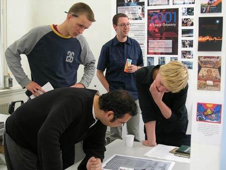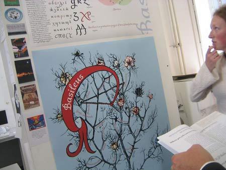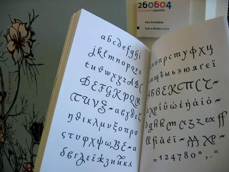 Единственной представительницей России Верой Евстафьевой (Vera Evstafieva) родина может быть очень довольна - Вера привезла ей из Голландии целое исследование о схожести трех алфавитов: кириллицы, греческого и латинского. Проведя полгода в библиотеках Академии она отыскала общие стили в истории этих трех алфавитов и на их основе разработала собственный шрифт. Эффект получился таким, что надписи набранные этим шрифтом на разных языках с разными алфавитами выглядят очень похоже друг на друга по общему восприятию текста: при этом слово, набранное латиницей отсылает нас в XV-XVI векa, кириллическое ассоциируется со скорописью XVI-XVII веков, а греческое - с Византией XIII-XV веков. А шрифт один и тот же!