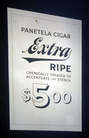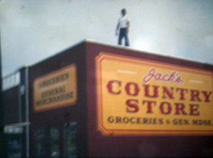 на крыше, а под ним вывеска сделанная его собственными руками.