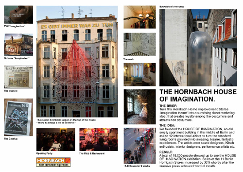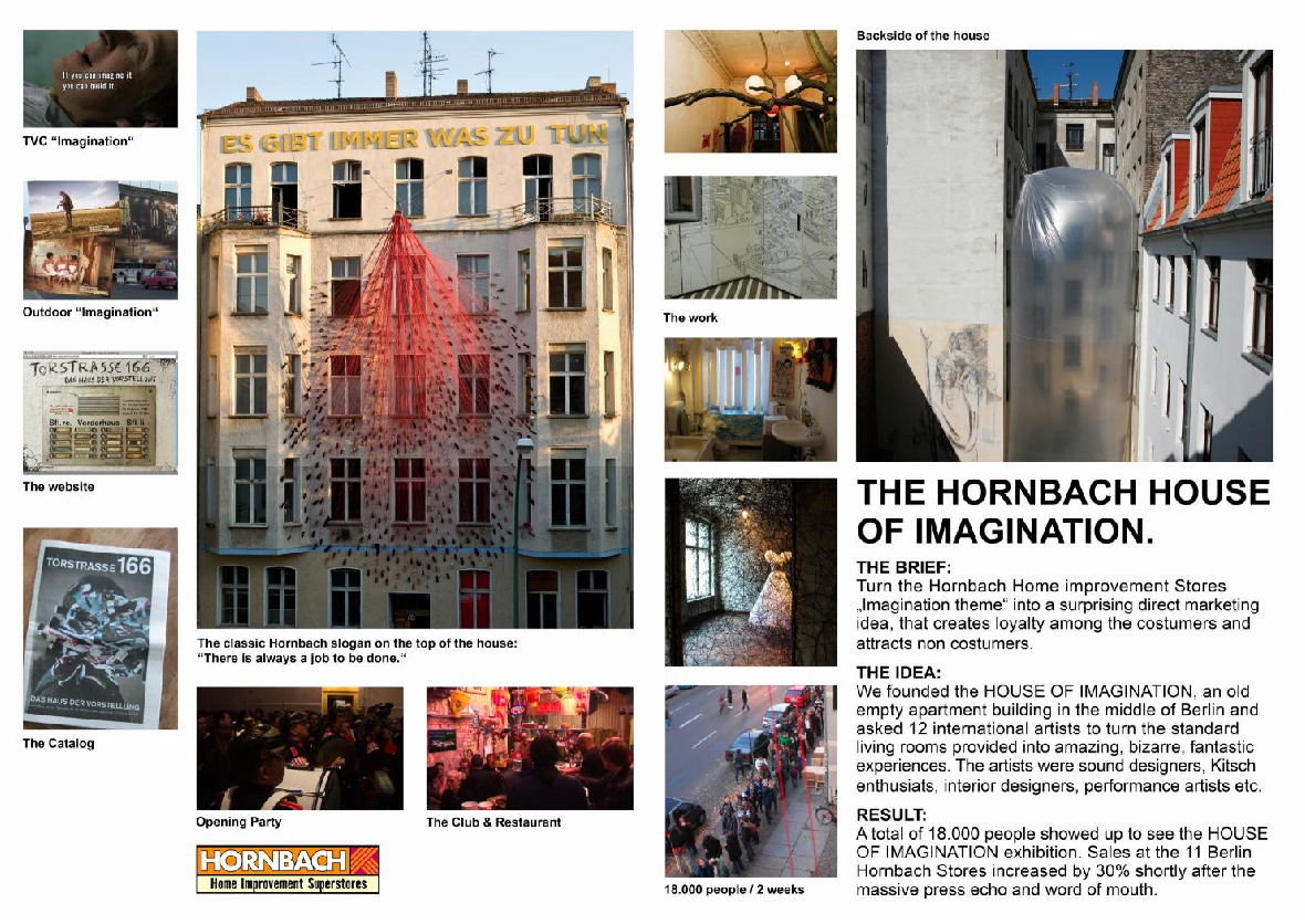 Гран-при в номинации Sales Promotion выиграла оригинальная акция от магазина товаров для ремонта Hornbach и агентства Heimat, Berlin. Двенадцать немецких художников и дизайнеров превратили заброшенное здание в Берлине в яркий арт-объект, что увеличило прибыль компании на 30%.