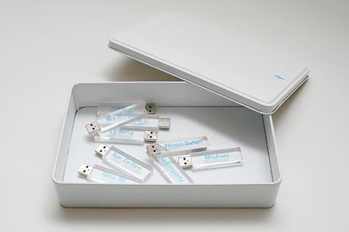 Универсальность этих носителей нашей памяти и чужой информации с непременным USB-входом, который лежит, наверное, уже в сумке каждого современного человека – то самое воплотившееся будущее, и, возможно, последняя переносная емкость перед тем, как чипы будут внедрять непосредственно под кожу. То есть такая знаковая часть жизни. С соответствующим отношением к ней дизайнеров: