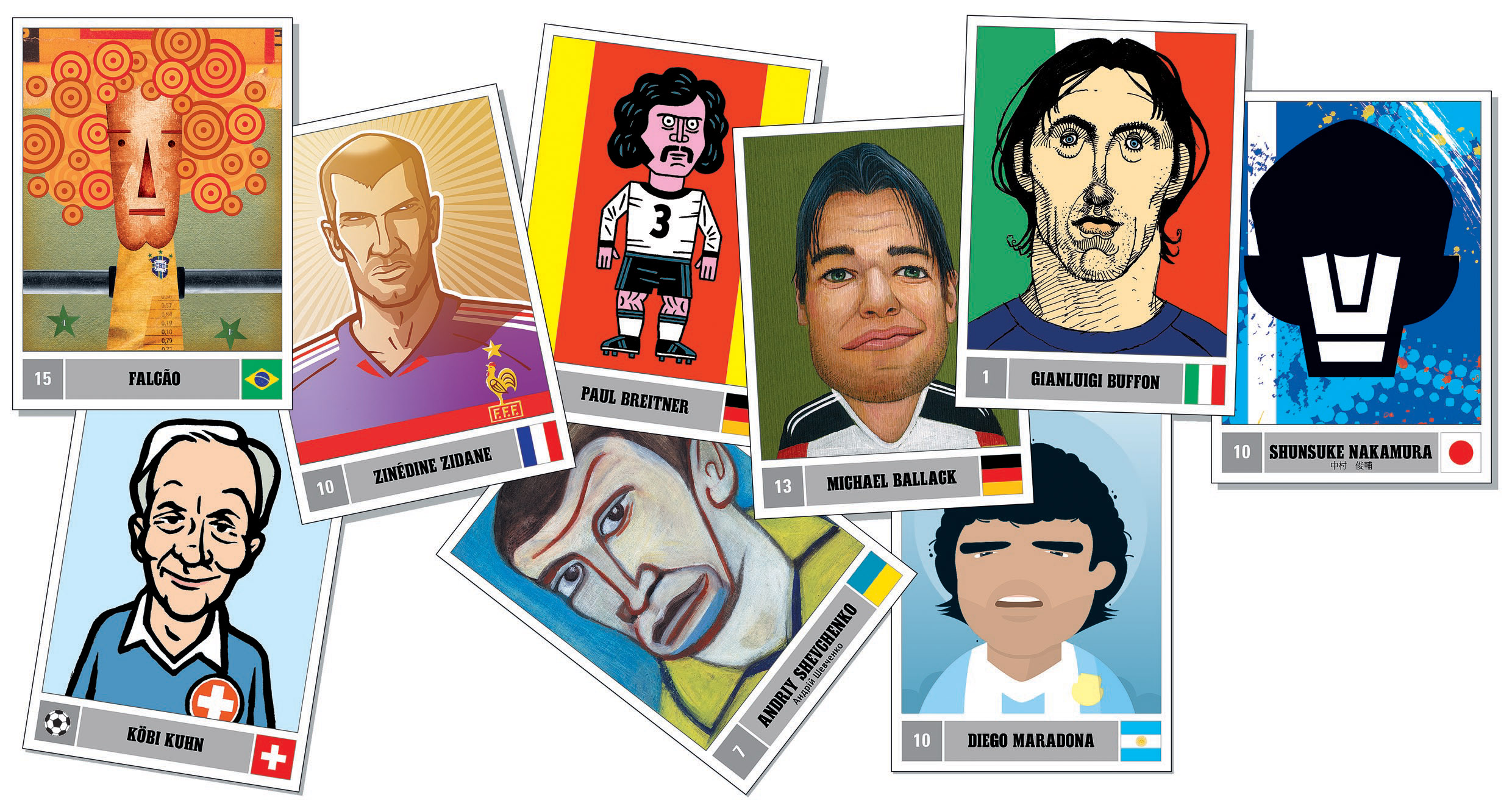 На самом деле, соревнования никакого не было. Просто в тайне каждый дизайнер хочет, чтобы его команда была лучше всех. Участники сборных не просто же футбольные герои, а национальные. У каждого своя харизма, а тут оказалось, что в одной команде, совершенно непохожей, казалось бы, на другую, можно найти схожие типы характера: кто-то выглядит придурковато, кто-то любезно, кто-то просто глупо. У многих заметно увеличены жевательные мышцы.