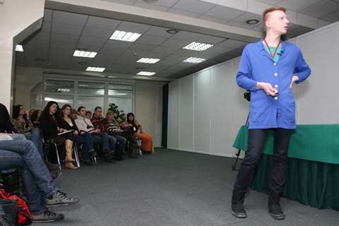 На семинаре Протея Темена аншлаг: люди стоят, сидят на корточках… Оказывается, продвинутым дизайном интересуются все. «Вживую» г-н Темен оказался вовсе даже и не таким трешевым, как казалось ранее, глядя на фото. Протей рассказал о четырех актуальных трендах в дизайне: позитивизм, свободный стиль, чистый стиль и неопаганизм. И все они – родом из области фешн-индустрии. «Поймать тренд можно, посмотрев на модный показ. И тогда вы поймете, что актуально сейчас. И ваша задача – считать это». Рассказ сопровождался обильными картинками на тему, и многочисленная армия слушателей неустанно щелкала затворами фотоаппаратов. В результате уже не аудитория подстраивалась под ведущего, а наоборот, Протей менял картинки с той частотой, на которую способны рекламисты-фотолюбители.