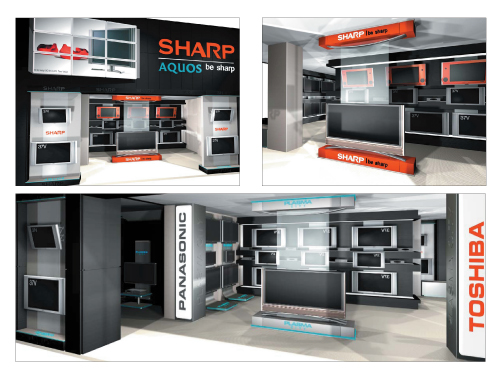 Концепт дизайна интерьера предполагал резкое выделение магазина на фоне соседних торговых точек павильона. Внимательно изучив все преимущества и недостатки местоположения торговой площади внутри павильона, мы решили использовать возможности высокого фасада магазина. Крупный, эффектно подсвеченный, красный логотип SHARP, размещенный высоко над входом в салон, сразу привлекает внимание посетителей. Масштабность фасада и стильная подсветка зрительно увеличивают площадь магазина, создается впечатление его "двухэтажности". Большие плазменные телевизоры выступают в качестве самостоятельных элементов интерьера. Стильные лайт-боксы придают дизайну строгость и технологичность.