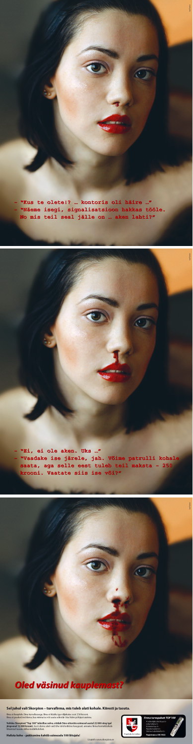 A full four-page spread of an attractive secretary appeared in an issue of the business daily. She had apparently fallen victim to violence. The copy on the first three pages was in dialogue form: the secretary calls the security firm and bargains with the dispatcher, trying to get the firm to send a patrol car. The woman's face becomes bloodier in the course of the negotiation. The idea was based on a real problem-a monopoly security firm demands surcharges for each deployment and as a result the firm's employees prefer to check on the situation themselves. The final page offered a solution to the problem-choose Scorpion: they don't bargain with your safety and always show up for no extra charge.