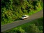A car drives up an idyllic mountain road to soft music. Suddenly, a monster jumps into the frame,