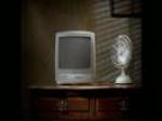 We see a TV and a fan on top of a piece of furniture. The fan pushes the TV every time it turns toward it, until the TV falls off the chest of drawers. Signature: The best Furniture Polish. Poliflor.