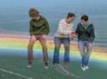 Three teens are sitting on a rainbow, eating Skittles. When one of the teens