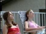 Two teenage girls sunbathe next to a pool. The little brother sneaks up and jumps into the pool in