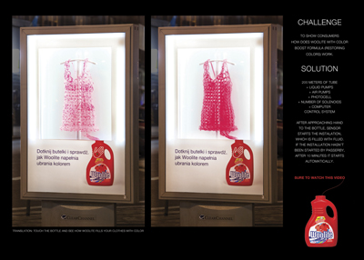Product and services: WooliteRegistrant: EURO RSCG WARSAWCountry: POLANDBrand name: Reckitt BenckiserAdvertising agency, city: Euro RSCG WarsawArt director: Rafal RysCopywriter: Magda BanasikCreative director: Jacek SzuleckiAccount Director /Manager: Malgorzata Szerenos Creative idea explanation: An installation that consumers could interact with. By the press of a button the colour revitalisation benefit came to life in a spectacular way – woven plastic tubing formed in the shape of a dress were filled up with colour from a bottle o Woolite. If the installation was not initiated by consumers, it activated itself automatically every 10 minutes. The promotion was based on the idea that “Wollite brings back colour to clothes” and the benefit of colour revitalisation. In order to bring this idea to life an installation was build for consumers to interact with: 200 meters of tubing, 4 liguid-pumps, 4 air-pumps, 1 Motion Sensor, 2 Solenoid Valves and a computerised control system. By the press of a button woven plastic tubing formed in the shape of a dress were filled up with colour from a bottle o Woolite.