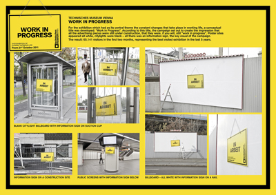 Product and services: Exhibition „Work in progress“Registrant: WIEN NORD WERBEAGENTUR GMBHCountry: AUSTRIABrand name: Technisches Museum ViennaAdvertiser: Technisches Museum ViennaAdvertising agency, city: WIEN NORD Werbeagentur GmbH, ViennaArt director: Andreas Lierzer, Stefan KopinitsCopywriter: Michael WittmannCreative director: Edmund Hochleitner, Eduard Bohler, Bernd WilfingerAccount Director /Manager: Markus Mazuran, Stella Biehal Creative idea explanation: For the exhibition which had as its central theme the constant changes that take place in working life, a conceptual title was developed:“Work in Progress”. According to this title, the campaign set out to create the impression that all the advertising pieces were still under construction, that they were, if you will, still “work in progress”. Poster sites appeared all white, citylights were blank – all there was an information sign, the key visual of the campaign. The result: 65,141 visitors in the first two months, representing the best visited exhibition since 5 years.