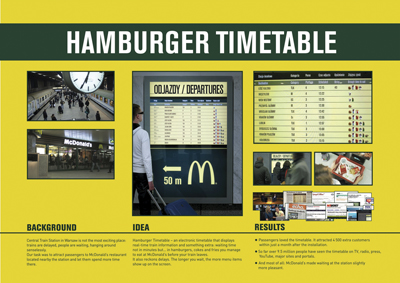 Creative idea explanation: Hamburger Timetable installed on the way to McDonald's at the Central Train Station in Warsaw. It displays real-time train information and something extra: waiting time not in minutes but in... hamburgers, cokes and fries you manage to eat at McDonald's before your train leaves. It also reckons delays. The longer you wait, the more menu items on the screen.