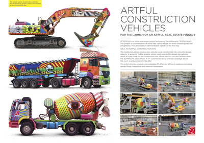 Product and services: ConstructionRegistrant: TBWA/ISTANBULCountry: TURKEYBrand name: Bay Insaat / 42 MaslakAdvertising agency, city: TBWA\ISTANBUL, ISTANBULArt director: Mustafa GulsenCopywriter: Sanli KayabolenCreative director: Ilkay Gurpinar, Evren DograrPhotographer: Emre DogruAccount Director /Manager: Burcu Ozdemir Kayimtu, Guler Balta Creative idea explanation: 42 Maslak is a niche construction project that is a combination of artful flats, artful offices, an artful shopping mall and art galleries. The promotion demonstrates the philosophy of the construction, 'Artful Living' right from construction phase. The traditional yellow construction vehicles were transformed into colourful design objects by a group of selected Turkish graphic artists. The production and execution period lasted in total for 3 weeks. 42 Maslak sales office is on a skyscraper looking down on the construction site. The best way to fulfill the promise of the construction company, designing 'Artful Living', is to let the target audience see the artful construction site. After all, if even a construction site is that artful, the outcome would never be less. This was the launch event of the brand 42 Maslak. The brand awareness rose unexpectedly, as the artful vehicles took coverage on design blogs, national magazines and newspapers. In two weeks time, the company recieved hundreds of calls, and from the recently started construction project, over 80 offices and flats were sold.