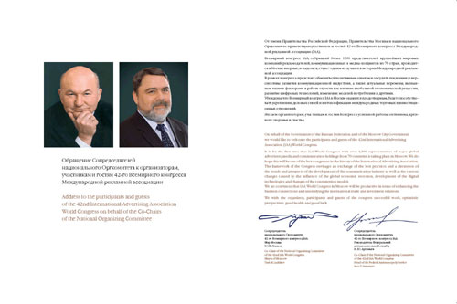 42-й Всемирный конгресс Международной рекламной ассоциации, который впервые проходит в российской столице, гостеприимно распахнет перед своими делегатами двери Государственного Кремлевского Дворца с 12 по 14 мая 2010 года. Шаговая доступность площадки Конгресса по отношению к древнейшему общественно-культурному центру города - Московскому Кремлю налагает на организаторов почетные имиджевые обязательства.
