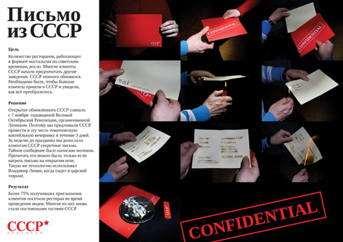 Оценка: II место Участник Рекламная ассоциация ВОСХОД Название работы: П-3/7 Письмо из СССР Конкурс/номинация: Магазины и рестораны Дизайнер: Дмитрий Маслаков Авторы: Александр Пархоменко, Евгений Примаченко, Андрей Губайдуллин Рекламодатель: Ресторан СССР Описание команды: Креативный директор - Андрей Губайдуллин Арт-директор - Владислав Деревянных Копирайт - Александр Пархоменко, Евгений Примаченко Дизайн - Дмитрий Маслаков, Юрий Шевченко Оценка: III место Участник Лео Бернет Название работы: П-3/18-3 DIY_tribune Конкурс/номинация: Магазины и рестораны Серия: Do It Yourself Дизайнер: Klubnikin Авторы: Tatiana Fedorenko Рекламодатель: Praktiker Описание команды: Сделать ремонт своими руками и стать образцом хорошего вкуса и авторитетом в делах обустройства дома - легко с "Praktiker"