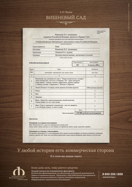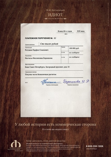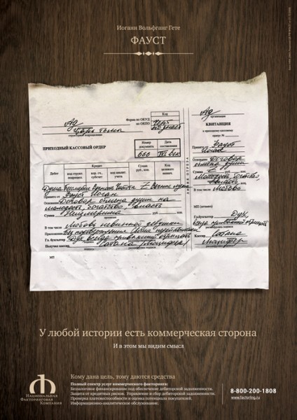 Оценка: I место Участник Рекламная ассоциация ВОСХОД Название работы: П-4/1-1 English Конкурс/номинация: Реклама услуг и корпоративная реклама Серия: Брайтон Дизайнер: Дмитрий Маслаков Авторы: Александр Пархоменко, Евгений Примаченко Рекламодатель: Школа языков Брайтон Описание команды: Креативный директор - Андрей Губайдуллин Креативная группа - Александр Пархоменко, Евгений Примаченко Арт-Директор - Владислав Деревянных Дизайнер - Дмитрий Маслаков Оценка: I место Участник ООО "АМК "Знаменка" Название работы: П-4/44-1 Идиот | П-4/44-2 Вишневый сад | П-4/44-3 Преступление и наказание | П-4/44-4 Фауст Конкурс/номинация: Реклама услуг и корпоративная реклама Серия: Коммерческая сторона Дизайнер: Евгения Федотова Авторы: Максим Севастьянов, Андрей Лебедев Рекламодатель: Национальная Факторинговая компания Описание команды: Креативный директор - Руслана Харитонова; Арт-директор- Максим Севастьянов, Алик Мамедов; Копирайтер - Андрей Лебедев; дизайнер - Евгения Федотова; директор по работе с клиентами - Александра Бирюкова Оценка: II место Участник Рекламная ассоциация ВОСХОД Название работы: П-4/1-2 Deutsch Конкурс/номинация: Реклама услуг и корпоративная реклама Серия: Брайтон Дизайнер: Дмитрий Маслаков Авторы: Александр Пархоменко, Евгений Примаченко Рекламодатель: Школа языков Брайтон Описание команды: Креативный директор - Андрей Губайдуллин Креативная группа - Александр Пархоменко, Евгений Примаченко Арт-Директор - Владислав Деревянных Дизайнер - Дмитрий Маслаков Оценка: III место Участник Рекламное агентство Небо Название работы: П-4/7 Комар Конкурс/номинация: Реклама услуг и корпоративная реклама Авторы: РА Небо Рекламодатель: ОАО ТКТ Описание команды: Креативный директор: Владислав Макаров, Наталья Смелова. Старший копирайтер: Татьяна Виноградова Старший арт-директор: Cергей Кожара