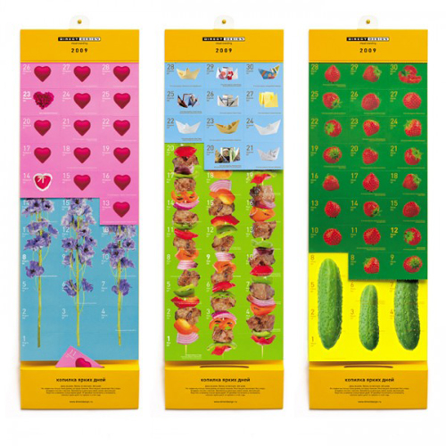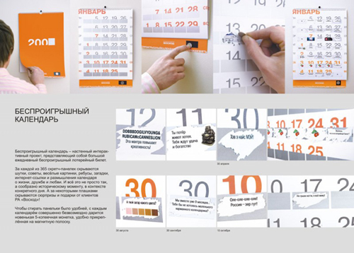 Оценка: I место Участник Гагарин коммуникационное агентство Название работы: П-6/20 Календарь-счеты Конкурс/номинация: Календарь, каталог, годовой отчет Дизайнер: Станислав Ушаков Авторы: Станислав Ушаков Рекламодатель: Ставропольпромстройбанк Описание команды: Идея и дизайн: Станислав Ушаков Фотограф: Григорий Брянцев Оценка: II место Участник Рекламная ассоциация ВОСХОД Название работы: П-6/4 Беспроигрышный календарь Конкурс/номинация: Календарь, каталог, годовой отчет Дизайнер: Дизайнерская группа РА Восход Авторы: Творческая группа РА Восход Рекламодатель: РА Восход Оценка: II место Участник DIRECT DESIGN Visual Branding Название работы: П-6/22 Календарь "Копилка я рких дней" Конкурс/номинация: Календарь, каталог, годовой отчет Дизайнер: ДДВБ Рекламодатель: ДДВБ Описание команды: Жизнь идет день за днем, месяц за месяцем, год за годом. Многие дни пролетают без следа. Но живем мы по-настоящему только теми днями, которые помним. Оторвите листок прожитого для, запишите самое яркое и волнующее и опустите его в копилку ваших самых ярких дней. И тогда 31го декабря вы сможете посмотреть и вспомнить, сколько ярких дней вы прожили в этом году Оценка: III место Участник Great Название работы: П-6/31 Вспомнить всё Конкурс/номинация: Календарь, каталог, годовой отчет Дизайнер: Андрей Мордовцев Авторы: Андрей Мордовцев Рекламодатель: АСКОН