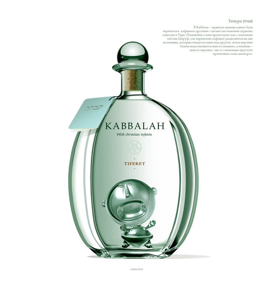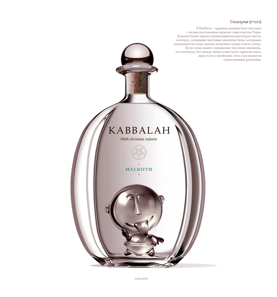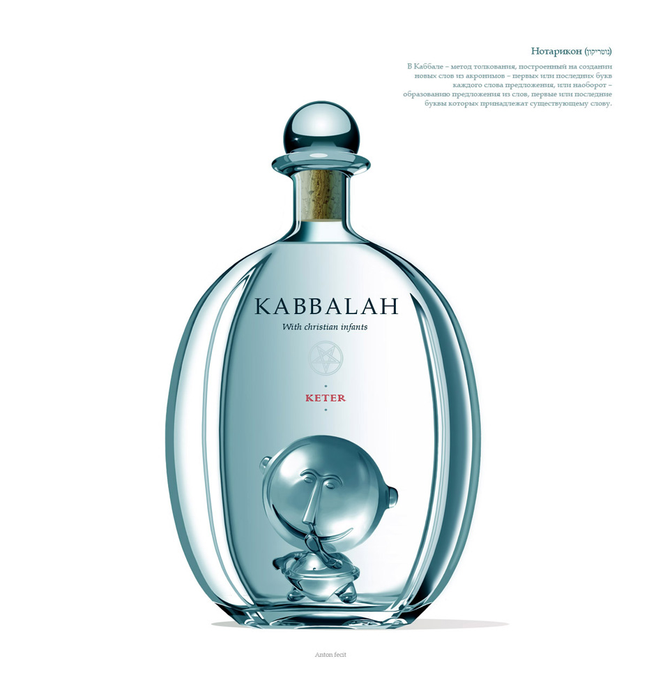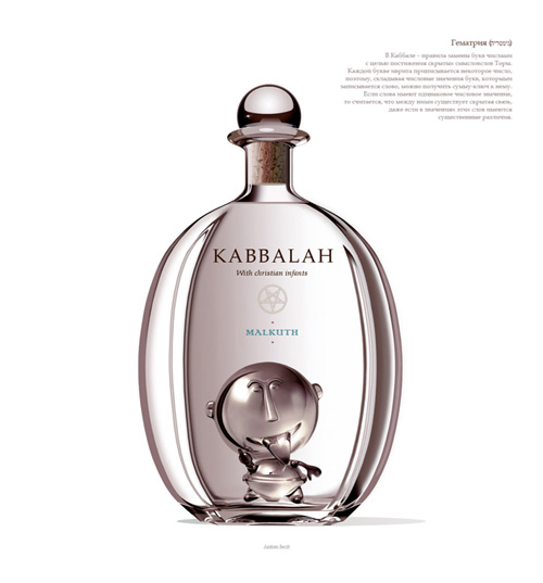 Идея 8. Музыкальный пылесос Electrolux Пылесос Electrolux существует в единственном экземпляре. Сотрудники компании Electrolux создали концептуальный музыкальный пылесос UltraSilencer Music Edition. Модель отличается встроенными стереоколонками и портом для iPod. Если подключить плеер через специальный центрально-расположенный порт, пылесос будет воспроизводить любимые мелодии через стереодинамики, встроенные в верхнюю часть корпуса пылесоса. Питание плеера происходит за счет мощности UltraSilencer, который расходует на 30% меньше электроэнергии, чем обычный пылесос, достигая при этом высокого качества уборки. Концептуальную модель не планируется запускать в массовое производство, но у всех желающих есть возможность разместить предварительный заказ. И, если меломанов наберется достаточно много, первый в мире MP3- пылесос поступит в продажу. Прототипная модель UltraSilencer представлена в следующих цветах: песочный металлик, белый лед, фисташковый металлик. Идея 9. Водка "Каббала (на христианских младенцах)" В Рунете довольно активно муссируется информация о новом водочном бренде "Каббала (на христианских младенцах)". В качестве автора упоминается компания EZ Protocols, которую невозможно найти. В релизе, распространяемом через ЖЖ, говорится: "Рецепт этой водки долгое время считался утерянным. В годы перестройки выяснилось, что технология её изготовления была тайно вывезена из России в 1922 году Николаем Бердяевым на так называемом "философском пароходе". Далее через Освальда Шпенглера и "теософское общество Елены Блаватской" рецепт водки "Каббала (на христианских младенцах)" попал в руки Николая Рериха и был в конце концов передан им на сохранение в высокогорный гималайский ашрам, где и находился до недавнего времени. Напиток ориентирован на сильных, уверенных в себе мужчин из высших слоёв общества, предпочитающих публичности влиятельность и точно знающих, какова природа власти в России. Характерно, что рекламная компания продукта была начата с рассылки анонимных клубных карт и подпольных предпродаж на интернет-аукционах, где только за первые сутки было реализовано около тринадцати тысяч пятилитровых коробов водки "Каббала (на христианских младенцах)" - абсолютный рекорд для брендов данной категории. Маркетологи компании EZ Protocols выбрали для продукта слоган "Permute This!" (Переставь это!), что, по их замыслу, должно рождать ассоциации как с практикой науки Каббалы, так и с повседневной политической практикой потребителей данного напитка. Стандартный ящик водки "Каббала (на христианских младенцах)" вмещает десять бутылок, их набор сформирован случайным образом из десяти сортов водки, названных по числу каббалистических сефирот - десяти ступеней эманации божественной сущности в мир: Кетер, Хохма, Бина, Хесед, Гевура, Тиферет, Нецах, Год, Йесод и Мальхут. Так же случаен выбор оттенка бутылочного стекла и изречения из Торы, записанного на обратной стороне бутылки. Фигурки младенцев повторяются крайне редко, не более трёх раз (скорее всего это символизирует три способа каббалистической пермутации текстов Торы - гематрию, нотарикон и темуру). Учитывая объёмы производства продукта, количество фигурок потенциально огромно. Это уже привело к появлению в России нескольких крупных частных коллекций водочной скульптуры. Сформировался даже своего рода чёрный рынок по продаже сте