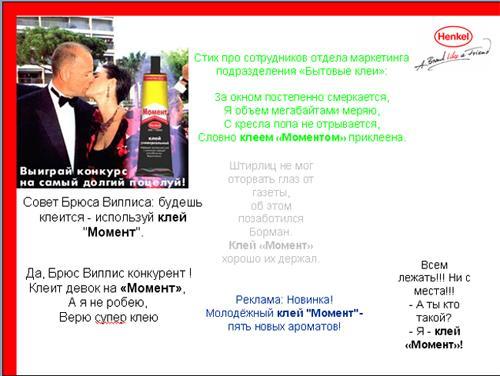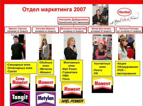 Весь ассортимент клея разделен на категории, и каждый менеджер по продукту отвечает за свою категорию: ведет продукт от момента зарождения идеи до реального воплощения, разрабатывает бизнес-план и реализует программу продвижения. Общую координацию работы осуществляет руководитель отдела маркетинга и директор подразделения «Бытовые клеи». Офис построен по принципу «открытого пространства» и все менеджеры взаимозаменяемы.