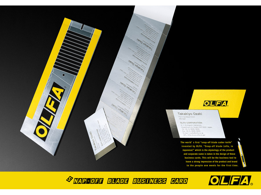 Basic description of the project: The world’s first “snap-off blade cutter knife” invented by OLFA. “Snap-off blade (olfa, in Japanese)” which is the etymology of the product and corporate name is taken in the design of these business cards. This will be the business tool to leave a strong impression of the product and brand to the people one meets for the first time.
