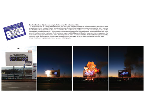 Credits Corporate Name of Client: Deadline Express Couriers Agency: Colenso BBDO, Auckland Executive Creative Director: Richard Maddocks Copywriters: Jamie Hitchcock/Josh Lancaster Art Directors: Josh Lancaster/Jamie Hitchcock Account Director: Brent Smart Media Strategist: Andrew Reinholds Agency Producer: Paul Courtney Designer: Simon Redwood Interactive Producer: Rebecca Holt Production Company: Rollercoaster Design Production Company Producer: Greg Skinner Interactive Creative: Mark Addy Web Technical Consultants: Richard Pilkington/Daniel Too