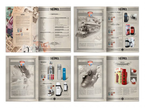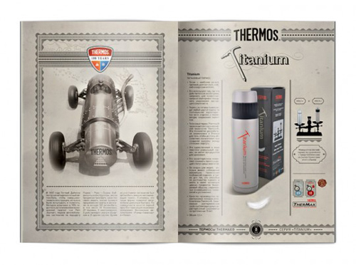 Годовой отчет "Природная химия" Студия рекламных решений "Птица" Графический дизайн / Многостраничные издания (год.отчеты, буклеты, каталоги, меню) Рекламируемый продукт: Годовой отчет компании Зачастую, люди не отдают себе отчёт, насколько плотно продукция химической промышленности вошла в нашу повседневную жизнь. К сожалению, под влиянием СМИ у общества сложился стереотип, что химия является чем-то оторванным от природы, неестественным, сугубо человеческим. Настоящая концепция годового отчёта выстроена, как своеобразное информационно - визуальное доказательства того, что современная химическая промышленность - гармоничное дополнение к миру, который существует вокруг нас. Первым средством утверждения будет являться то, что визуальное изображение основных объектов, при иллюстрировании годового отчёта построено в виде молекулярной решётки. При удалении от глаз читателя иллюстрация смотрится, как обычный рисунок, при приближении становятся видны изображения молекул, составляющие единое целое. Этот довольно прямой намёк с одной стороны наглядно показывает читателю, что всё существующее есть, в определённом смысле, ни что иное, как органические и неорганические химические соединения. Вторым средством утверждения выступает соединение визуальных изображений существ мира насекомых на фоне контуров промышленных построек, производственных помещений и пр. Мир насекомых был избран в качестве материала визуализации неспроста. С одной стороны, мир насекомых вездесущ. Фактически, они круглый год окружают человека, в каких бы местах человек ни находился. Даже за Полярным Кругом. С другой стороны, ряд видов насекомых составляют достаточно крупные сообщества с чётко сложившейся иерархией, определёнными механизмами <социального регулирования> и др. С третьей стороны, жизнь насекомых представляет собой нескончаемую череду химических процессов, жизненно необходимых для всех сторон жизнедеятельности их колоний. Каталог "Thermos" Дизайн-студия ЛИН-АРТ Графический дизайн /Многостраничные издания (год.отчеты, буклеты, каталоги, меню) Рекламируемый продукт: Термосы Тhermos. Великие открытия Большинство великих достижений человечества было бы невозможно без термоса. В качестве основных иллюстраций использованы обработанные "под фотографию" 3D-иллюстрации удивительных транспортных средств, корпус которых изготовлен из гигантских Термосов. Издание оформлено в стилистике Steam-punk.