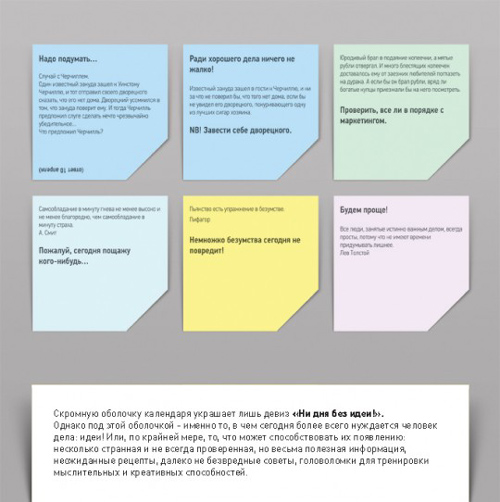 Ни дня без идеи Иллан Графический дизайн /Календари Рекламируемый продукт: Таможенная и транспортная логистика На Новый, 2009 год компания АРИВИСТ подарила своим партнерам и VIP-клиентам самый "обычный" подарок за всю свою историю: оформленный в пастельной цветовой гамме отрывной календарь. Нарочито скромную оболочку украшает лишь девиз <Ни дня без идеи!>. Однако под этой оболочкой - именно то, в чем сегодня более всего нуждается человек дела: идеи! Или, по крайней мере, то, что может способствовать их появлению: несколько странная и не всегда проверенная, но весьма полезная информация, неожиданные рецепты, далеко не безвредные советы, головоломки для тренировки мыслительных и креативных способностей: Сам календарь тоже сконструирован весьма необычно и представляет собой непростую головоломку: Как открывать, чтобы не разорвать? Как отрывать, чтобы открывался новый, насыщенный идеями день, а не пустое и беспросветное серое поле? Не надеясь на то, что каждый из одариваемых VIP сможет самостоятельно решить эти задачи, авторы снабдили календарь стихотворной инструкцией на основных языках мировой экономической мысли: русском, английском и китайском. Корпоративный слоган компании АРИВИСТ гласит: <Идеи движут миром, грузом, товаром>. И новый календарь, разработанный в рекламной группе <ИЛЛАН>, вполне поддерживает традиционную для этого рекламодателя тему.