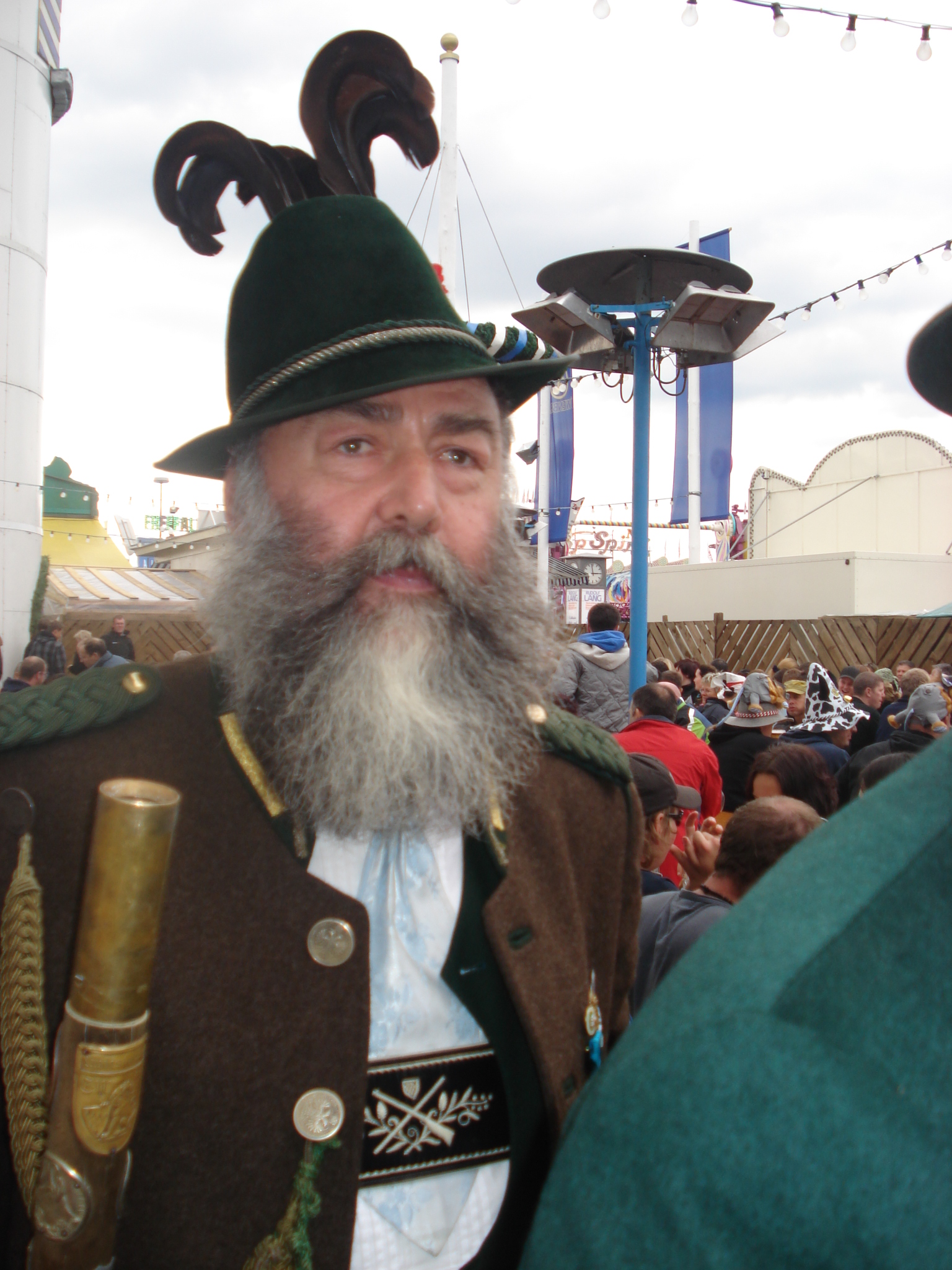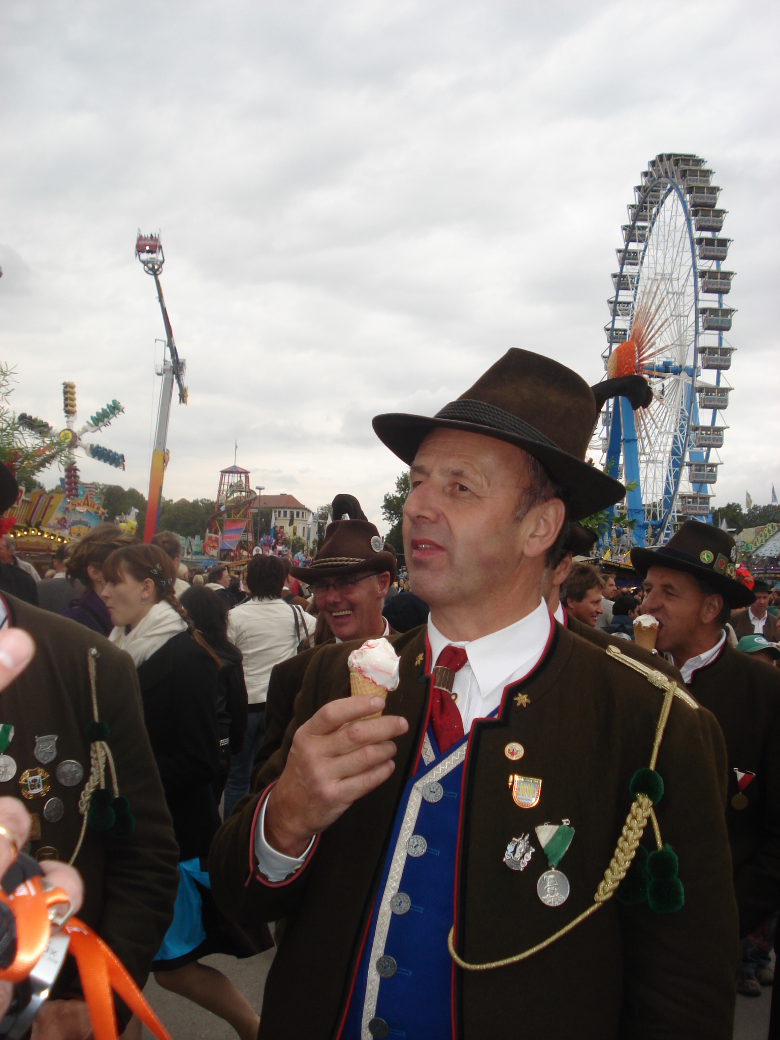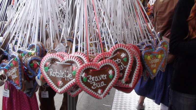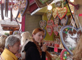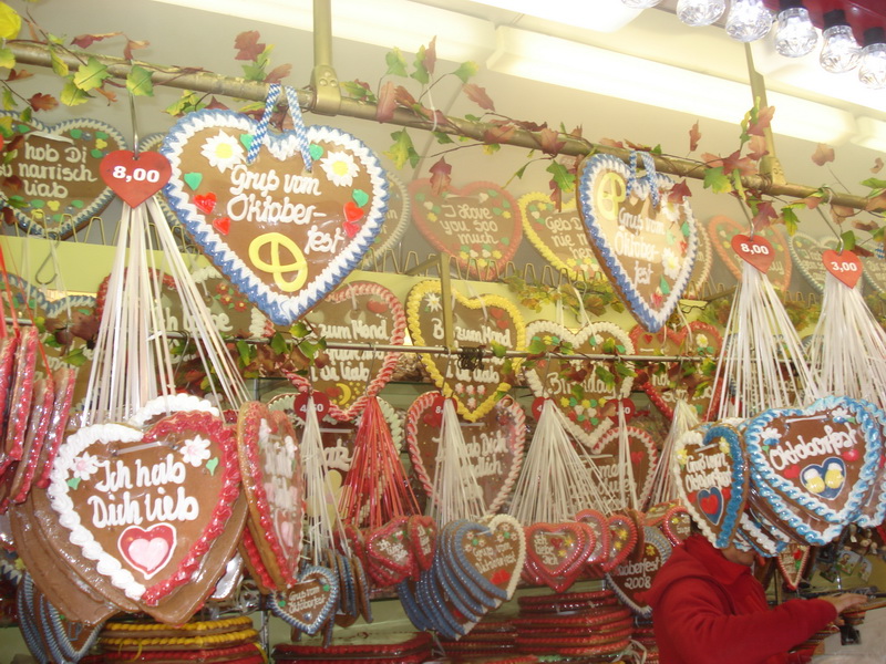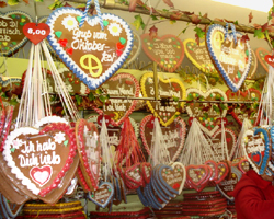 Первое - пиво. Без всяких рассуждений ясно, что пива много, оно хорошее и разное. Соперничают Paulaner, Spatenbrau, Lowenbrau и Hofbrauhaus и другие пивоварни поменьше. Пиво - это, так сказать, виновник торжества, и о нем много говорить не приходится. Его нужно пить. Второе - сердечки. По всему городу и особенно в парке Theresienwiese продаются сердца из перечного печенья. От самых крошечных до огромных, эти сердца - непременный атрибут Октоберфест. Люди используют их в качестве украшения и носят на шее, используют и по назначению - едят, в качестве вкусных подарков - преподносят друг другу, покупают детям. На печеньях пишутся замысловатые поздравления и пожелания, самое распространенное - Ich liebe dich, которое в переводе не нуждается. Здесь открывается простор для творчества, подобный свободе в создании рисунков и надписей на майках. Сердечки весят в витринах магазинов, в машинах за лобовым стеклом, их изображают на кружках, майках, плакатах. Это настоящий фетиш Октоберфест, наравне с пивом. Сердечки символизируют душевность и демократичность праздника, на котором человек человеку - друг, товарищ и брат (конечно, за исключением карманников). Третье - карусель. Все гости праздника видят колесо обозрения в луна-парке. На нем нужно прокатиться, полюбоваться Мюнхеном, без этого праздник не будет полным. Карусель - символ веселья, восторга и безудержной радости. Четвертое - баварские песни. Они звучат и на улицах, и в пивных павильонах. Люди с упоением подпевают знакомым словам, чокаясь огромными пивными кружками с шапками пены. Пятое. В самом парке продаются невообразимые сосиски - их десятки видов, некоторые длинной около полуметра. Я никогда не думал, что хот-доги можно сделать совершенно по-разному. Но в павильонах их десятки видов - с копченой рыбой, селедкой, грибами, с красными, белыми и прочими сосисками и даже вегетарианские. Пожалуй, такое блюдо, как хот-дог, стоит распробовать. Шестое, последнее, но не по важности, а только по порядковому номеру - национальная одежда. На ней стоит остановиться подробнее. Дело в том, что многие баварцы и гости Мюнхена носят именно народные костюмы, это создает подлинную атмосферу Октоберфест. Мужчины надевают характерные шляпы с перьями, укороченные штаны или даже шорты, гольфы с бантами, клетчатые рубашки, шейные платки, украшенные металлическими брошками. Женщины затягивают корсеты поверх глубоко декольтированных кружевных блузок с буфами, надевают пышные юбки, чепцы или шляпки, аккуратные белые переднички. Одинаковый элемент одежды для всех - вязаные кофты. Национальные костюмы продаются на каждом углу. Нарядиться в настоящего баварца стоит от 200 евро, и ты постоянно испытываешь соблазн сделать это, хотя и понимаешь, что в следующий раз ты сможешь воспользоваться этим костюмом только на каком-нибудь шуточном костюмированном маскараде, если он приключится в твоей жизни. Ну не ходить же в коротких штанах по Москве! Но на празднике в Мюнхене нужно выглядеть именно так. Среди баварцев очень много мужчин с большими, торчащими в стороны усами. Они выглядят как персонажи фильмов о 19-м веке, но они живут сейчас и здесь, работают в магазинах, аптеках, офисах. И они являются частью этой неповторимой баварской атмосферы.