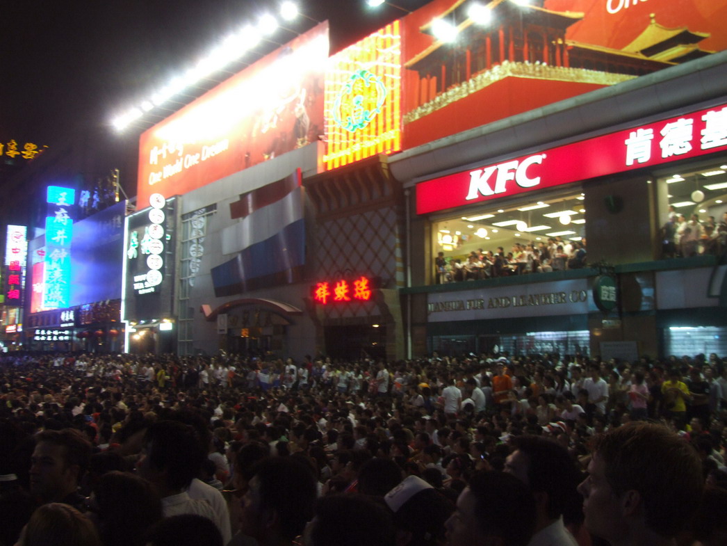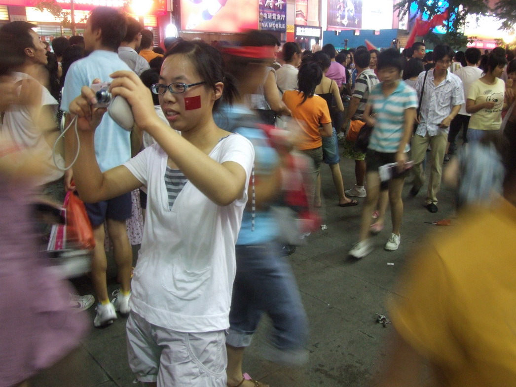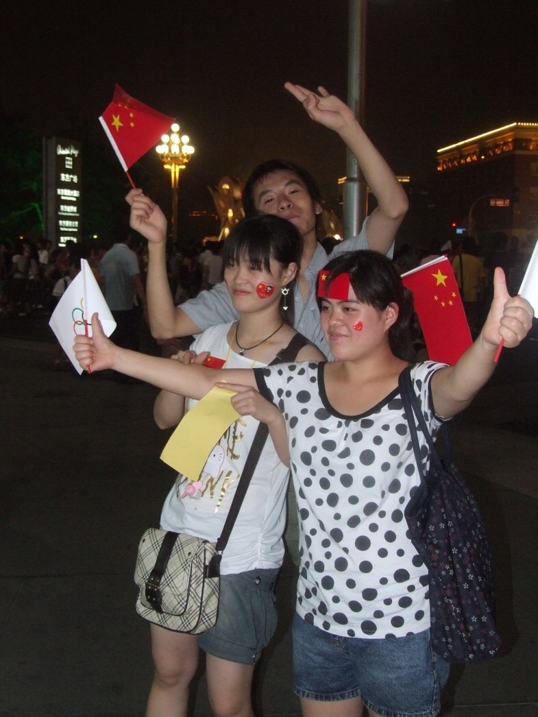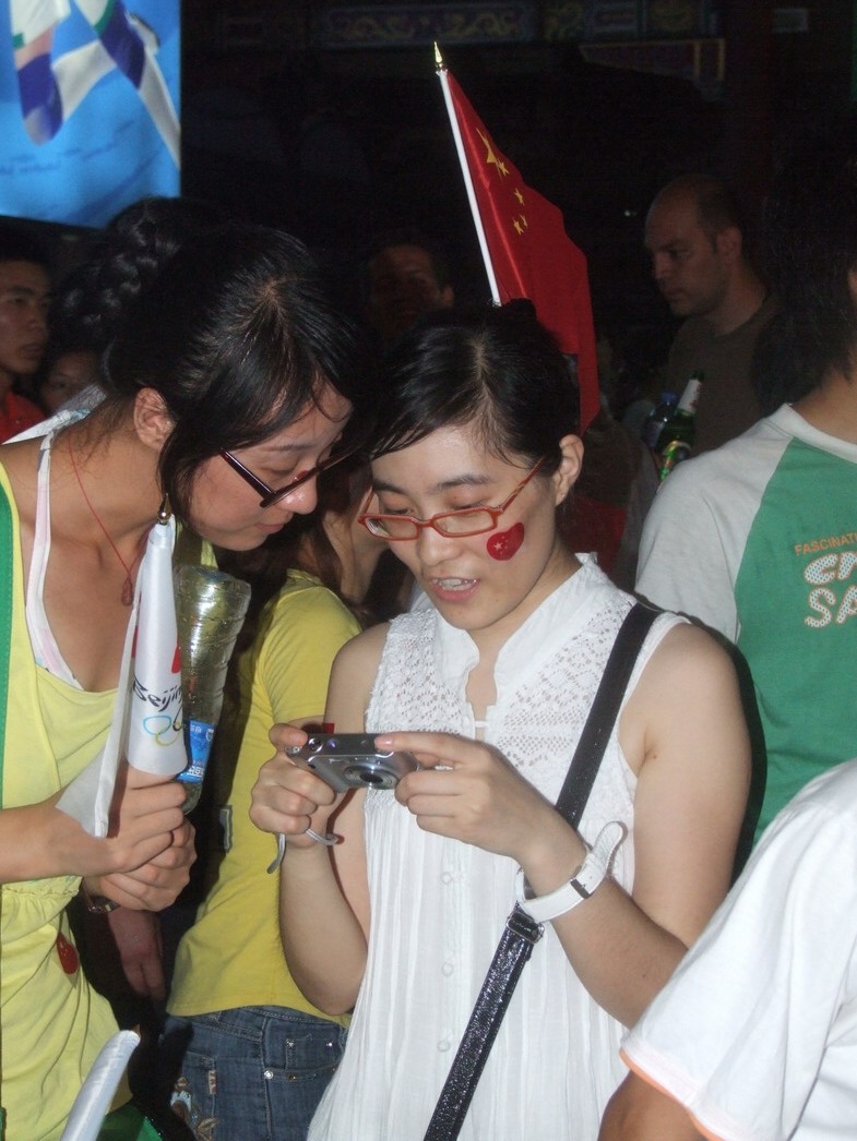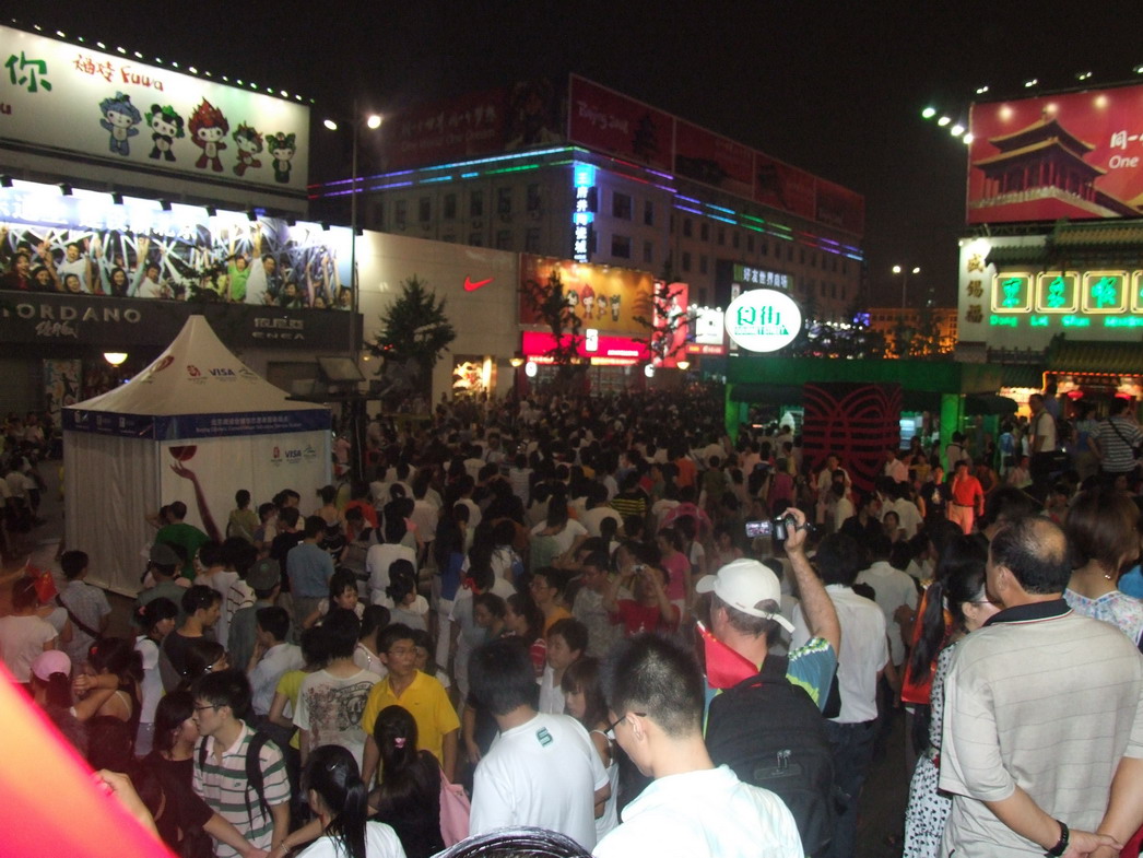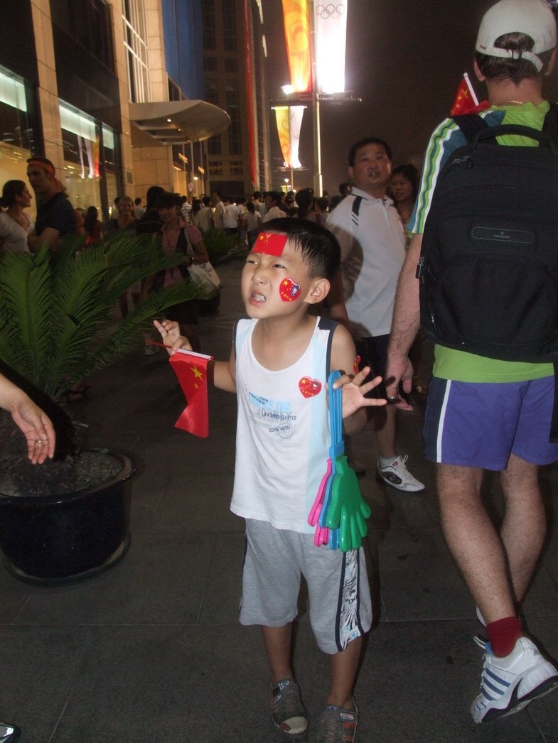 План Б. Вся улица - переполнена. Европейцев много, как никогда за эти дни, но все равно они в явном меньшинстве. Китайцы размахивают красными флагами - большими и маленькими, все жмутся к огромному экрану на котором начинается шоу. Выбраться из толпы нельзя, человеку с клаустрофобией стало бы плохо. Но вокруг чувствуется всеобщий восторг. Происходящее на экране толпа встречает криками. Мы не понимаем, что значат иероглифы, которые составляют из себя артисты, а толпа понимает и ревет что есть мочи. Внезапно появляется группа из десятка бразильцев они устраивают дикий танец и толпа расступается. В другом месте группа китайцев с флагами что-то скандируют и толпа отзывается на их призывы. В общем мы вдоволь наобщались с китайским народом. Очень плотно. Так как церемони продолжается довольно долго мы переходим к плану C.