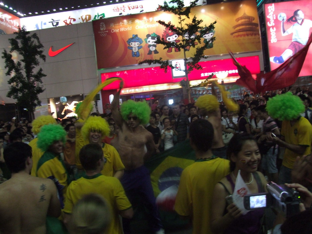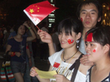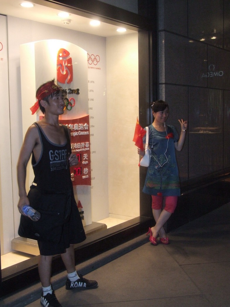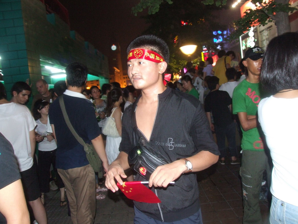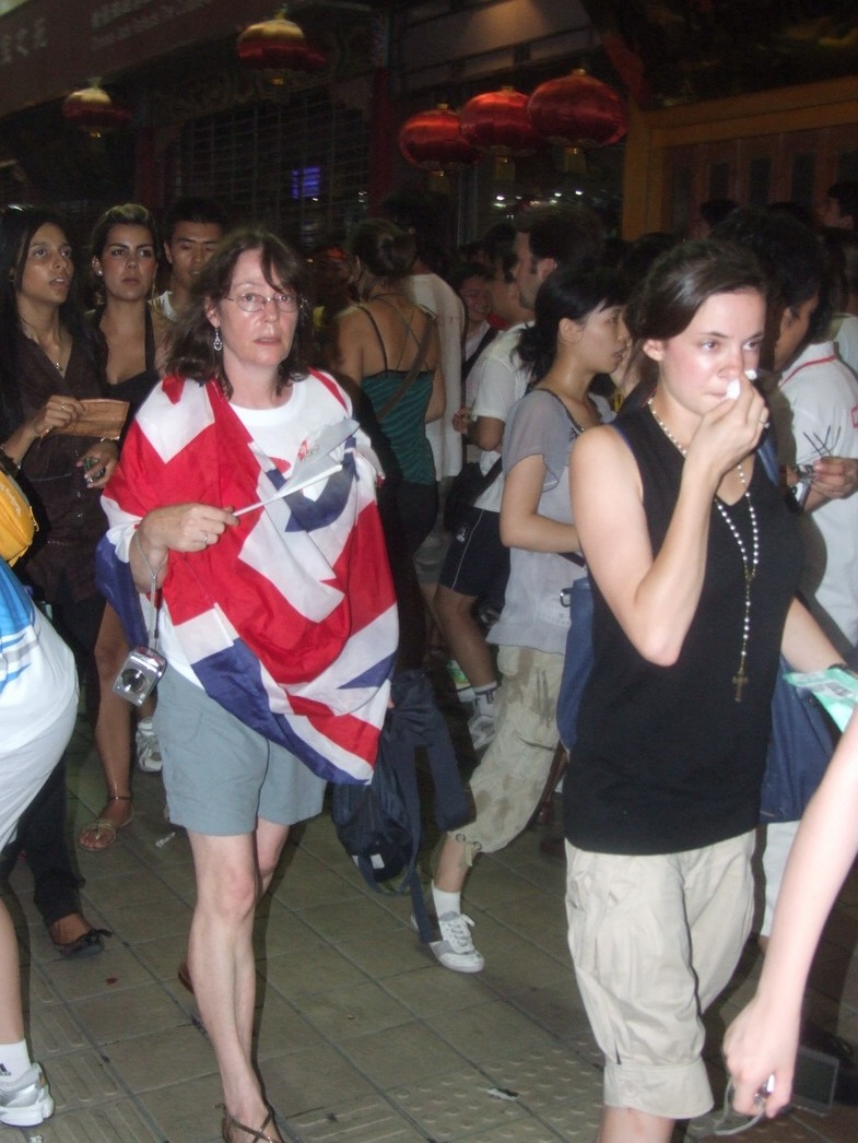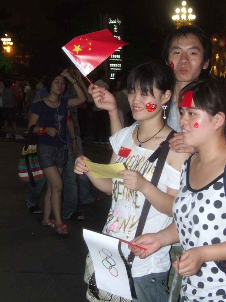 План Б. Вся улица - переполнена. Европейцев много, как никогда за эти дни, но все равно они в явном меньшинстве. Китайцы размахивают красными флагами - большими и маленькими, все жмутся к огромному экрану на котором начинается шоу. Выбраться из толпы нельзя, человеку с клаустрофобией стало бы плохо. Но вокруг чувствуется всеобщий восторг. Происходящее на экране толпа встречает криками. Мы не понимаем, что значат иероглифы, которые составляют из себя артисты, а толпа понимает и ревет что есть мочи. Внезапно появляется группа из десятка бразильцев они устраивают дикий танец и толпа расступается. В другом месте группа китайцев с флагами что-то скандируют и толпа отзывается на их призывы. В общем мы вдоволь наобщались с китайским народом. Очень плотно. Так как церемони продолжается довольно долго мы переходим к плану C.