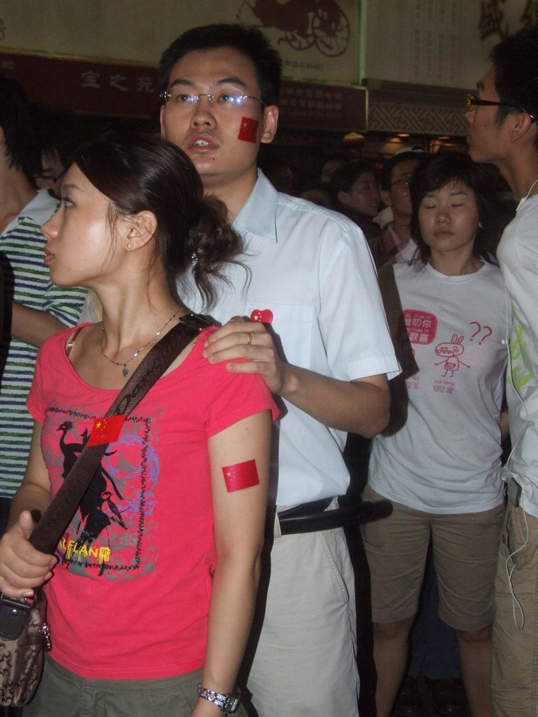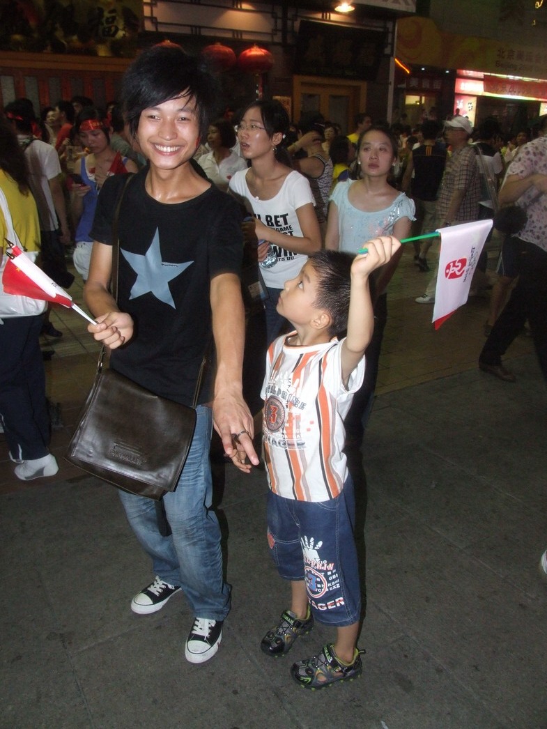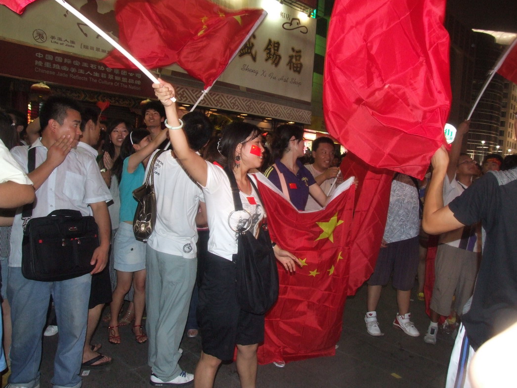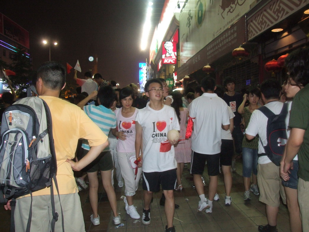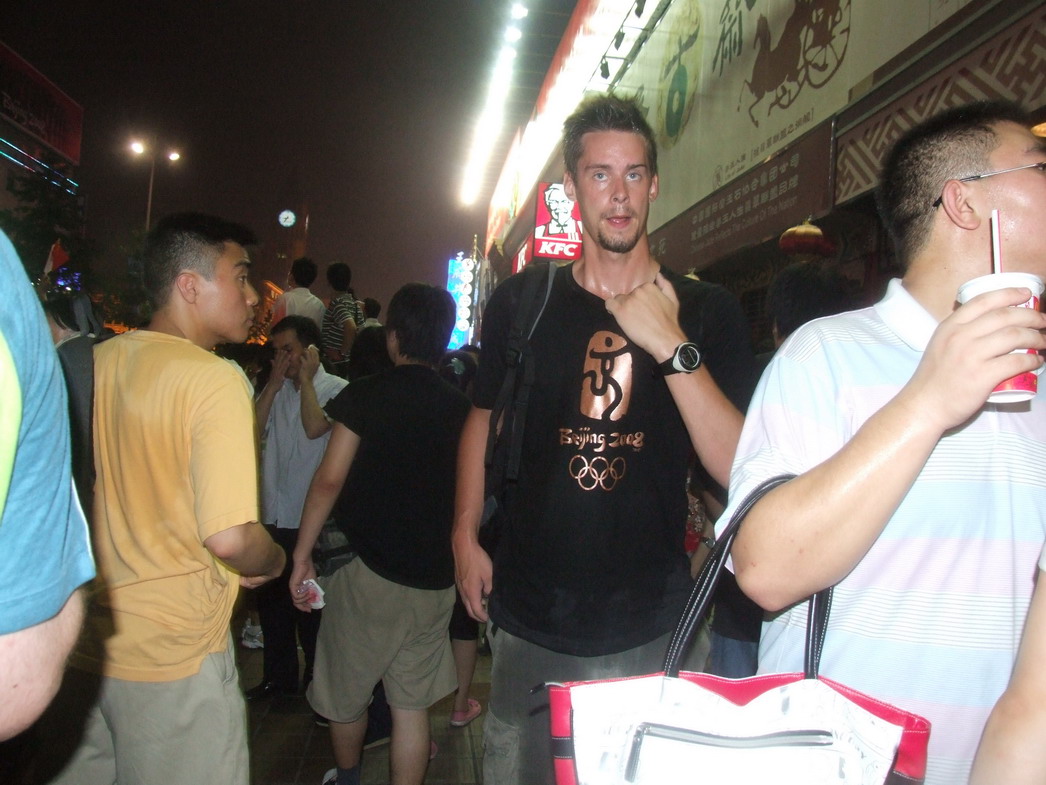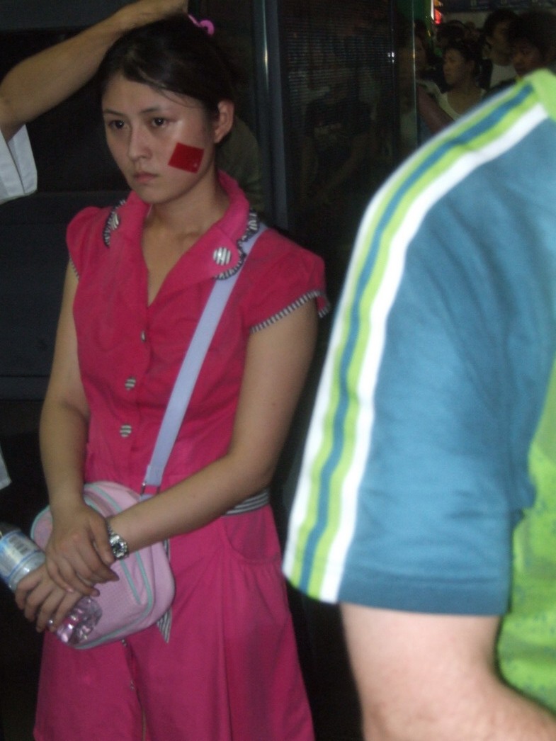 План Б. Вся улица - переполнена. Европейцев много, как никогда за эти дни, но все равно они в явном меньшинстве. Китайцы размахивают красными флагами - большими и маленькими, все жмутся к огромному экрану на котором начинается шоу. Выбраться из толпы нельзя, человеку с клаустрофобией стало бы плохо. Но вокруг чувствуется всеобщий восторг. Происходящее на экране толпа встречает криками. Мы не понимаем, что значат иероглифы, которые составляют из себя артисты, а толпа понимает и ревет что есть мочи. Внезапно появляется группа из десятка бразильцев они устраивают дикий танец и толпа расступается. В другом месте группа китайцев с флагами что-то скандируют и толпа отзывается на их призывы. В общем мы вдоволь наобщались с китайским народом. Очень плотно. Так как церемони продолжается довольно долго мы переходим к плану C.
