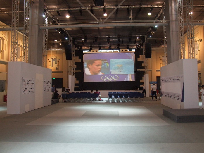 Здесь есть кофе, место для прессы и огромный проекционный экран для болельщиков. Пожалуй, лучший экран из всеx, что мы видели в Пекине. За дуэлью американских и итальянских лучников наблюдают человек 10 итальянцев, несколько китайцев и мы, двое русских. Соревнования лучников оказались исключительно интересными, кто бы мог подумать! Мы налили себе местного кофе (Lavazza) и принялись болеть за итальянцев. Правда, когда они победили в зале радостно закричали только мы. Хм...
