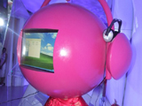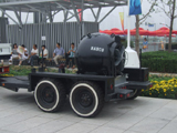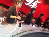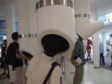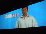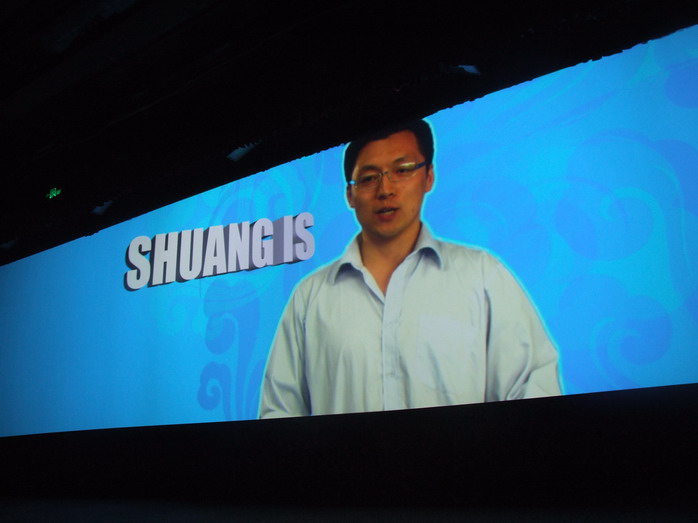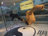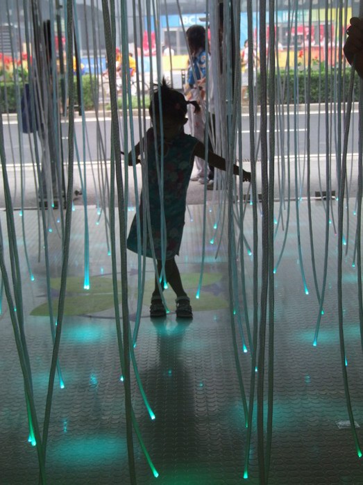 Перед стендом установлен потрясающий водопад. Под управлением компьютерной программы он разными порциями выдает воду, устраивая целые представления (вроде фонтанных опер). В частности - создает из падающей воды иероглифы (фраза странная, но иначе это ни описать, сфотографировать тоже не получится, очень уже прозрачный у иероглифа контур).