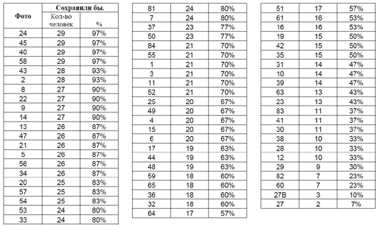 Третий вывод нашего исследования касается готовности женщин сохранить фотографию. Как упоминалось в начале, каждая из фотографий в исследовании оценивалась еще и с точки зрения того, сохранила ли бы ее испытуемая или нет. Оценки каждой из фотографий представлены в таблице 3.