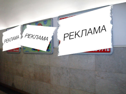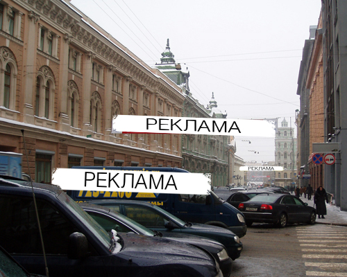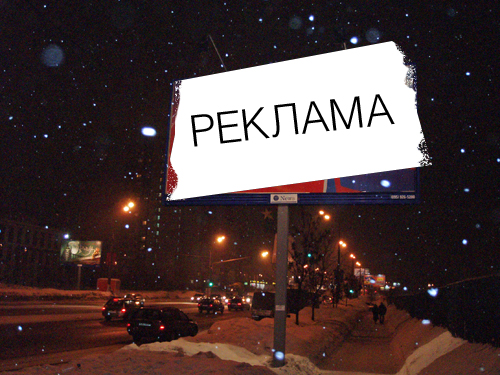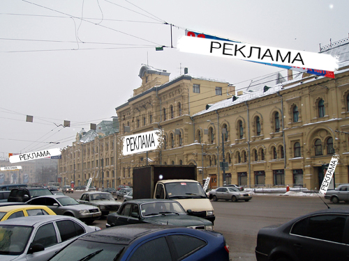 9.05 Шаг за дверь подъезда и среди утренних шумов и запахов новые раздражитель глазных рецепторов. Дружелюбные жесты глянцевых молодых людей, соблазнительные позы гламурных красавиц и все, что только можно вписать в прямоугольные форматы щитов, баннеров, перетяжек и пилонов. Это лишь часть рекламного винегрета большого города, а еще кузова автомобилей, фасады зданий и живописные мозаики подземелья метро.