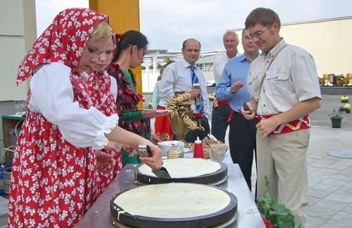 Поскольку ожидалось много гостей-иностранцев, решено было что официанты, аниматоры и даже организаторы должны быть одеты в русские народные костюмы. Ну, или в костюмы, которые иностранцы могут принять за русские. Площадка также была оформлена в русском стиле, музыканты исполняли народные мелодии, и меню тоже было русским. Но это я уже слегка забежал вперед. В общем, стилизованность под «русскость» была максимальной.