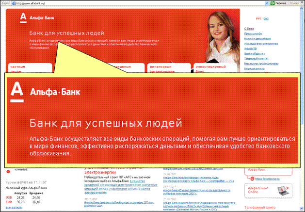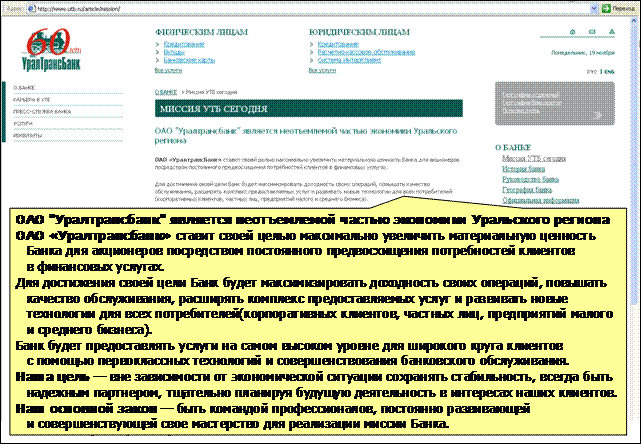 "Вы ведь знаете, где таится этот другой мир, и что мир, который вы ищете, есть мир вашей собственной души. Лишь в собственном вашем сердце живет та, другая действительность, по которой вы тоскуете. Я могу вам дать только то, что вы уже носите в себе сами, я не могу открыть вам другого картинного зала, кроме картинного зала вашей души. Я не могу вам дать ничего, разве лишь удобный случай, толчок, ключ. Я помогу вам сделать зримым ваш собственный мир, только и всего". Г.Гессе. Путешествие на Восток. Миссия к счастью или миссия поневоле? Речь в статье пойдёт о миссиях. На примерах миссий банков. Ещё недавно миссия и видение были очень модны. Многие организации ими обзавелись, многие делают это сейчас или думают об этом. Разработав миссии, большинство банков повесили их тексты на своих сайтах. Я пишу о том, что прочёл на сайтах банков, и что сам вижу вокруг. Я высказываю свою точку зрения и стараюсь быть в ней как можно более наивным и необусловленным чем-то/ кем-то, кроме того, что я вижу и чувствую[1]. Вот вопросы, ответы на которые я ищу в этой статье: -- Какие бывают миссии у банков? -- Зачем миссия нужна банку? -- Кому именно нужна миссия банка? -- Какой должна быть идеальная миссия банка? Уважаемый читатель! Это статья может быть ещё и маленьким практикумом для вас лично. Вы можете не только прочесть текст ниже и рассмотреть картинки, но и задать себе самому вопросы по своей организации. Итак, миссии банков. Какие они бывают? Посмотрим примеры. Миссия Альфа-Банка говорит о том, кем банк является и каким он хочет быть. Миссия в меру адекватна и амбициозна. Но ей не хватает яркости стимулирования, а сотрудники воспринимаются как приложение к банку. www.alfabank.ru/about/mission. Там же, где располагается миссия, выложен кодекс корпоративной этики ОАО "Альфа-Банк": www.alfabank.ru/f/1/about/mission/codex.pdf. Насколько он близок сотрудникам и вдохновляет их, настолько в нём есть польза. Позиционирование Альфа-Банка для такой миссии естественно. Одно влияет на другое. Невозможно долго и безнаказанно быть одним внутри, но другим снаружи. Люди прекрасно чувствуют это несоответствие и обман. www.alfabank.ru Сбербанк последователен в своей истории. На www.sbrf.ru миссия банка не обозначена. (Я её не нашёл). Но понимание себя и своего пути у банка явно есть. Может, это понимание называется по-другому, не миссией? Какая разница, как его назвать! Главное то, что оно руководит действиями банка. Коммуникация банка, которую я вижу, как будто нанизана на единый стержень. Это вызывает к нему доверие и обеспечивает успех. Сбербанк - народный банк. Так он и воспринимается большинством населения России. А "во что веришь, то и есть" - таков закон сознания. Пример развития и углубления истории Сбербанка. Любая коммуникация должна работать на марку и согласовываться с её миссией. Тогда это не пустые слова. А история марки, если она близка и интересна, является тем, что связывает с этой маркой людей. www.sbrf.ru/ruswin/download/News/Depositor_1.pdf