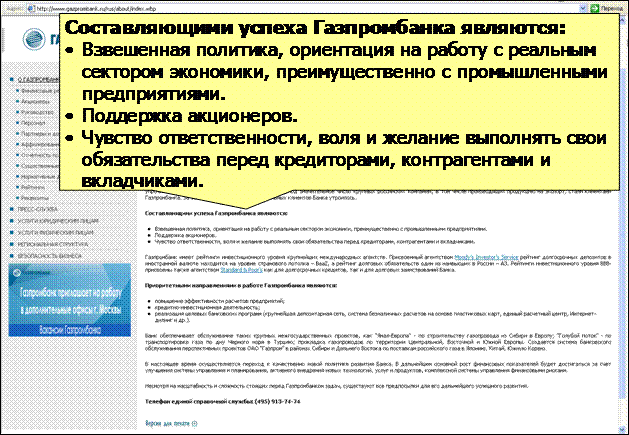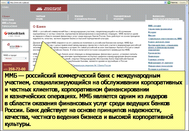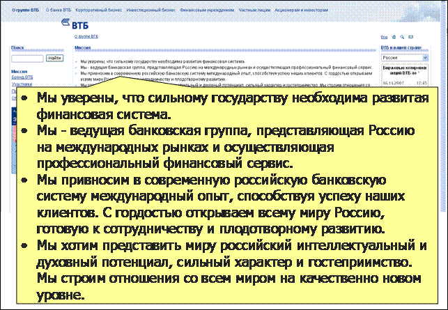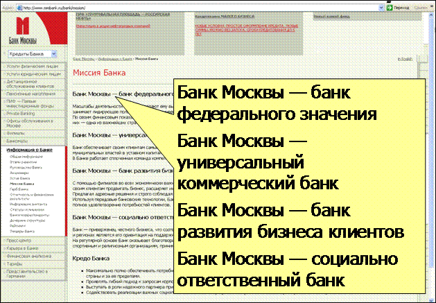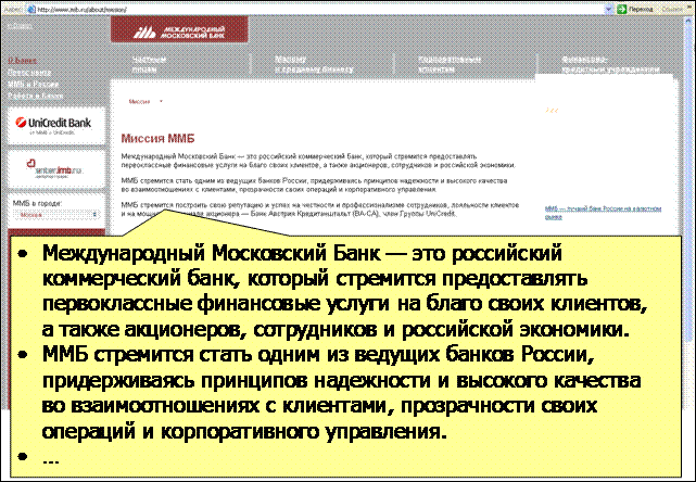 Примеры углубления истории Сбербанка и её развития в видении будущего (www.sberbank-history.ru и http://sbrf.ru/ruswin/concept/conc2012.pdf соответственно). В одном из разделов "Концепции развития Сбербанка до 2012 года" сказано: "Для сохранения своих позиций на рынке банк должен найти адекватные решения в области системы продаж, постпродажного обслуживания и продуктового ряда, которые позволят обслуживать большее количество клиентов при минимизации издержек и контроле над рисками … в условиях сокращения процентной маржи." Это честно. Иначе точно не удержаться в лидерах. А далее в концепции приведены конкретные способы достижения желаемого будущего. Группа ВТБ в миссии заявляет о своей важной государственной роли в судьбе России, в её внешних связях и развитии. Обладая такой миссией, ВТБ становится ближе к своей амбициозной цели - через 3-5 лет войти в топ-50 мировых банков. www.vtb.ru/rus/web.html?s1=1723&l=1. Меня миссия ВТБ вдохновляет больше, чем миссия Альфа-Банка. Но главное как это вдохновляет сам ВТБ. Ценности бренда ВТБ соответствуют его миссии и служат её достижению. А как иначе?! Всё элементы коммуникации - от миссии до последнего рекламного макета и младшего сотрудника - должны быть согласованы друг с другом, обязаны помогать осуществлению цели. Наше намерение и реальная миссия как его выражение - единственный доступный нам способ влияния на наше будущее. www.vtb.ru/rus/web.html?s1=1165&l=1. Девиз ВТБ "От характеристик - к ценностям" направлен на потребителей и, уходя от рациональных и часто одинаковых заявлений банков, привносит в выбор ВТБ эмоциональную составляющую сильного бренда. С миссией девиз согласован. Одно дополняет другое. www.vtb.ru ММБ в своей миссии пишет о стремлении к первоклассным финансовым услугам, о стремлении стать одним из ведущих банков и т.д. Вас это вдохновляет? А сотрудников? www.imb.ru/about/mission Текст ММБ из раздела "о банке" констатирует факты. К сожалению, таковы тексты большинства банков. В лучшем случае они говорят факты. В тексте есть формальности, но нет эмоциональной уникальности именно этой организации. Попробуйте описать характер такого банка, если бы он был человеком. Вам, как человеку, много ли времени захочется провести с таким брендом? Бренд действует на 90% в невидимой части айсберга наших эмоций. www.imb.ru/about Банк Москвы говорит то, что принято говорить. Но миссия, если она правдивая и искренняя, должна продолжаться во всех действиях организации и её сотрудников. www.mmbank.ru/bank/mission. Интересно, как согласуется эта миссия с идущим сейчас ребрендингом банка, бобрами и их "тонким" юмором в рекламе? Кредо Банка Москвы. Кредо (от лат. credo - верю), по определению БСЭ, "взгляды, убеждения, основы мировоззрения", которыми руководствуются в реальной жизни. Я не верю. И дело не только в моём личном опыте и опыте моих знакомых. Слова не искренни это штампы. www.mmbank.ru/bank/mission Миссия РС звучит вызывающе. Миссии РС хочется верить. Посмотрите - сколько РС сделал. И как бы сами банкиры и население ни относились к РС, у банка и Рустама Тарико есть чему поучиться. Другой вопрос насколько миссия реально близка сотрудникам банка и как она на деле их вдохновляет? www.rs.ru/ru/about Амбиции главы КИТ Финанс, Александра Винокурова, как и владельца РС, известны. Но кто же ещё должен быть вдохновителем и мотором бизнеса, если не владелец и не управляющий? www.broker.cf.ru Газпромбанк перечисляет составляющие своего 