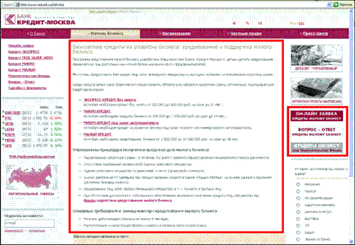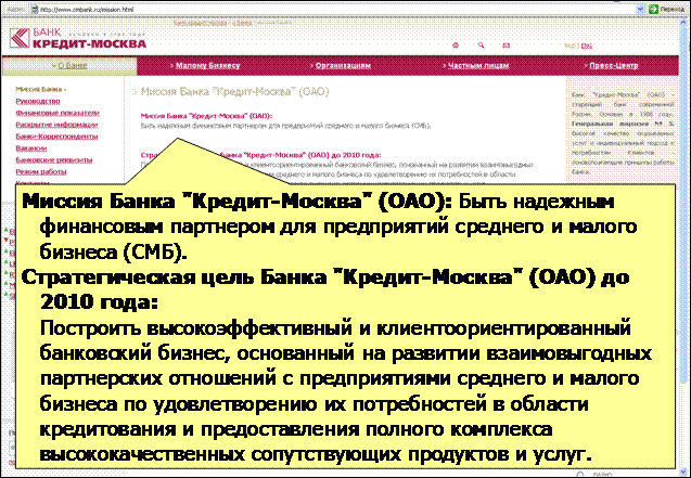 Нажимая на баннер заглавной страницы Банка "Кредит-Москва" попадаешь структурированные условия и тарифные планы кредитов на развитие бизнеса (http://www.cmbank.ru/255.html). Там же можно получить ответы на часто задаваемые вопросы, оформить заявку и рассмотреть возможность получения кредита под поручительство Фонда Содействия Кредитованию Малого Бизнеса Москвы (http://fs-credit.mbm.ru), куда наряду с другими уполномоченными банками входит Банк "Кредит-Москва". Такова миссия и цели Банка "Кредит-Москва" (www.cmbank.ru/mission.html) приоритетно реализуются на сайте банка. К сожалению, миссия не столь вдохновляет, как могла бы. Мы посмотрели разные примеры. Какие бывают миссии у банков? -- Есть те, которым мы верим. Но пустых слов и обещаний больше. -- Есть те, которые вдохновляют. Таких совсем мало. Никаких большинство.Правило Парето работает и здесь. Думаю, что около 4/5 всех миссий и текстов организаций (а то и больше) не имеют ничего общего с тем, что они делают и какими они на деле является. 4/5 являются просто пустыми словами, не приносящими никой пользы. Лишь данью моде ставшей стандартом. И это нормально для природы, для общества и для бизнеса. Перечислю негативные моменты этих 80%: Главную причину пустых слов этих 4/5 я вижу в непонимании банками самих себя. Большинство организаций смотрят на других, копируют конкурентов, и очень мало доверяют самим себе. Например, поделюсь своим опытом, при разработке бренда большинство топ-менеджеров и хозяев бизнеса ждут от консультантов правильных и умных слов, ждут, что консультанты за них сделают сладкую бренд-конфетку для потребителей как у ... (подставьте название компании на свой вкус). Консультанты может и рады помочь, но им приходится разрабатывать очередную красивую, но несбыточную мечту, часто потакая иллюзиям заказчика. Банк, получив разработку таких консультантов и в придачу кучу исследований, подтверждающих то, что нужно было подтвердить, думает: "Теперь у меня, как у всех, есть красивый бренд и миссия, дела пойдут лучше, я за неё хорошо заплатил умным ребятам". И чем больше заплатил - тем больше банк уверен в правильности сделанного. Каждый остаётся при своих. Это наиболее распространенный путь поддерживающий игру большинства организаций, которую можно назвать "мы не хуже всех". Понятно, что он никуда не ведёт, а организация развивается лишь по инерции. Я, в своей работе по бренд-консалтингу, в этом не раз убеждался. Есть другой путь, к которому мы пришли и сейчас используем, но это выходит за рамки темы этой статьи. Зачем миссия нужна? Обычно те слова, которым мы верими которые нас вдохновляют - уникальны, просты и очень личны для нас. То же самое должно быть и с хорошей миссией организации. Разве есть кто-то, кто лучше самой конкретной организации понимает себя? Миссия нужна, прежде всего, самой организации, чтобы выразить в ней свои вдохновенные мечты и реальные стремления к ним. Безусловно, миссии банков, как и их громкие заявления, влияют на рынок и акции, но, прежде всего, они влияют на сами банки. Миссия нужна для наития и вдохновения к тому, что только деньги сделать не в силах. Это то, для чего вы продолжали бы ещё некоторое время увлеченно работать, если бы денег не было. Хорошая миссия выражает то, ради достижения чего вы реально работаете. Поэтому миссия должна быть правдива лично для организации и вдохновлять её по пути к ц