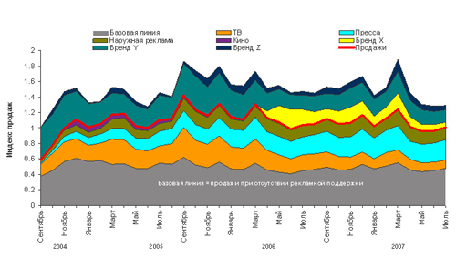 Таким образом, масса факторов, потенциально воздействующих на динамику продаж, а соответственно и финансового результата, остаются неучтенными. Конечно, анализ эффективности рекламных инвестиций, говоря о российском рынке, имеет свои особенности. В условиях быстро растущих темпов инфляции, в особенности это касается инфляции на российском рекламном рынке, все труднее становиться сделать прогноз относительно развития рынка, потребительского спроса, рентабельности инвестиций. Тем не менее, широко распространенный за рубежом метод экономико-статистического (эконометрического) моделирования в последнее время стал активно применяться и в нашей стране, внедряясь в процесс стратегического планирования и прогнозирование продаж. Широко применяемые наряду с эконометрическими моделями методы прогнозирования продаж на основе так называемых изолированных временных рядов, основанные на методах сезонной декомпозиции рядов динамики и построении трендовых аналитических моделей, способны давать достаточно точные краткосрочные прогнозы относительно объемов продаж, однако не способны ответить на вопросы маркетинговых отделов, иными словами способны ответить на вопрос «Что будет?», но не способны ответить на вопрос «Почему?», а главное «На что и в какой мере компания может повлиять?» На эти вопросы призваны ответить факторные модели, строящиеся на данных клиента, собранных за достаточно длительный период времени (минимум 3 года помесячно), позволяющие оценить вклад каждого из факторов, потенциально влияющих на продажи или иную моделируемую переменную. Конечно, окончательное решение по поводу того, как строить процесс контроля и планирования в компаниях на основе собственных расчетов и оценок или на основе проведенного экспертами статистического анализа остается в руках ее руководства, зачастую до сих пор консервативного в таких вопросах.