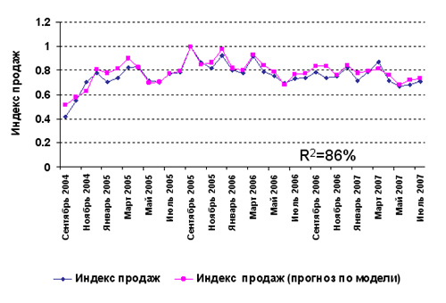 Не следует забывать, что любой случай уникален, а значит примять один и тот же вид модели для различных продуктов, категорий, периодов времени не правомерно. Поэтому в ходе моделирования важен не только грамотный математический подход, основанный на соответствии определённым статистическим критериям, но и, что не менее важен, логический анализ. Приняв во внимание все перечисленные факторы и особенности, была построена мультипликативная модель продаж, с учтенной сезонностью и вошедшими линейно факторами медийными, продуктовыми и рыночными. Причем, говоря терминами статистики, модель статистически значимая и адекватная, а значит с большой долей вероятности можно утверждать, что именно факторы, вошедшие в модель, объясняют большую долю вариации продаж.