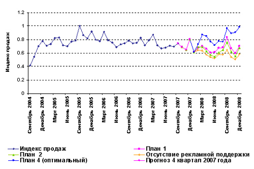 Как правило, в случае возникновения недовольства со стороны клиента качеством своего медиа размещения, он сначала пытается выявить реальные причины, породившие его неуверенность, вызванную может быть даже резким падением продаж. Поэтому нередко по результатам моделирования перед клиентом появляется реальная необходимость и возможность альтернативного плана размещения, что и было предложено для издательского дома. Имея информацию о рассмотрении клиентом различных вариантов размещения, команда BrandScience вынесла свой вердикт относительно каждого из планов и, конечно, дала свои рекомендации. Прогнозные сценария развития динамики продаж позволили численно сравнить, при каком плане размещения удастся добиться максимальных объемов продаж в ближайшем году. Оптимальным с этой точки зрения, однако, в некотором роде радикальным в сравнении с существующей ранее медиа - стратегией стал план, предложенный сотрудниками BrandScience, рекомендующий использование наружной рекламы и рекламы в кинотеатрах в качестве основных каналов коммуникации и предполагающий рост продаж в 2008 году на 13% в натуральном выражении по сравнению с 2007 годом.