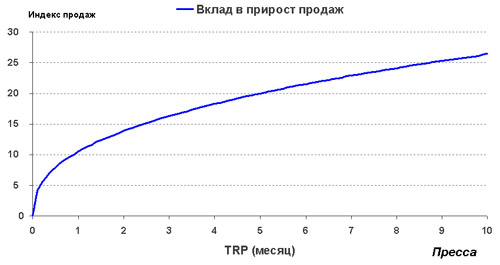 Построенные по данной эконометрической модели кривые отклика позволяют предполагать прессу как наиболее эффективный канал коммуникации, несмотря на достаточно ограниченные рекламные инвестиции.