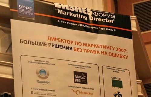 Очередное мероприятие, которое довелось посетить, проводилось компанией BBPG (Business To Business Production Group) и имело сразу два названия: "Бизне$-форум Marketing Director" и "Директор по маркетингу 2007: большие решения без права на ошибку".