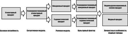 Как видно, товарная категория может быть «размазана» по этой схеме, особенно если мы говорим о демонстрационных продуктах. К примеру: есть утилитарные зажигалки, созданные чтобы только давать огонь. Есть усовершенствованные зажигалки, не гаснущие на ветру (как вариант). Есть имиджевые изделия – всем известный бренд Zippo, подразумевающий определенную ролевую модель потребителя. Есть зажигалки, ориентированные на культурный фактор – изделия от модных домов. Есть и зажигалки, сделанные по спец.заказу – индивидуализированный продукт. Как можно увидеть, в каждом случае мы сталкиваемся со своими причинами выбора, исходя из которых требуется и разрабатывать и продвигать продукт или бренд.