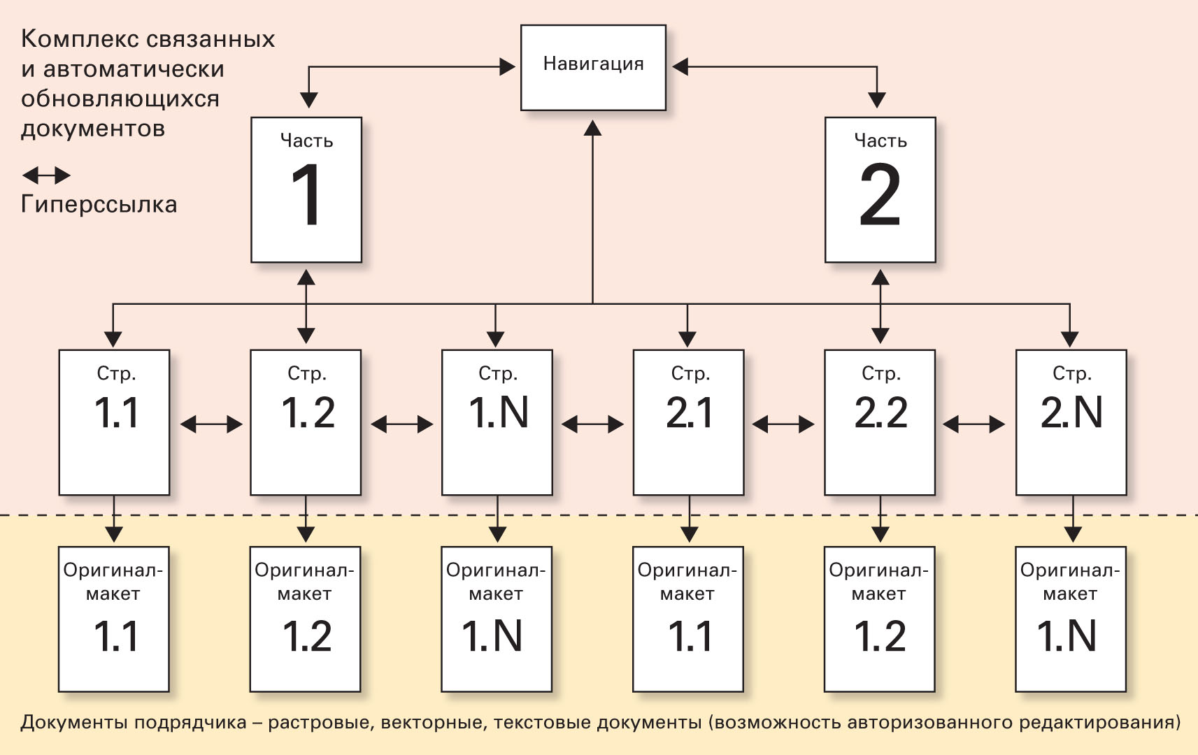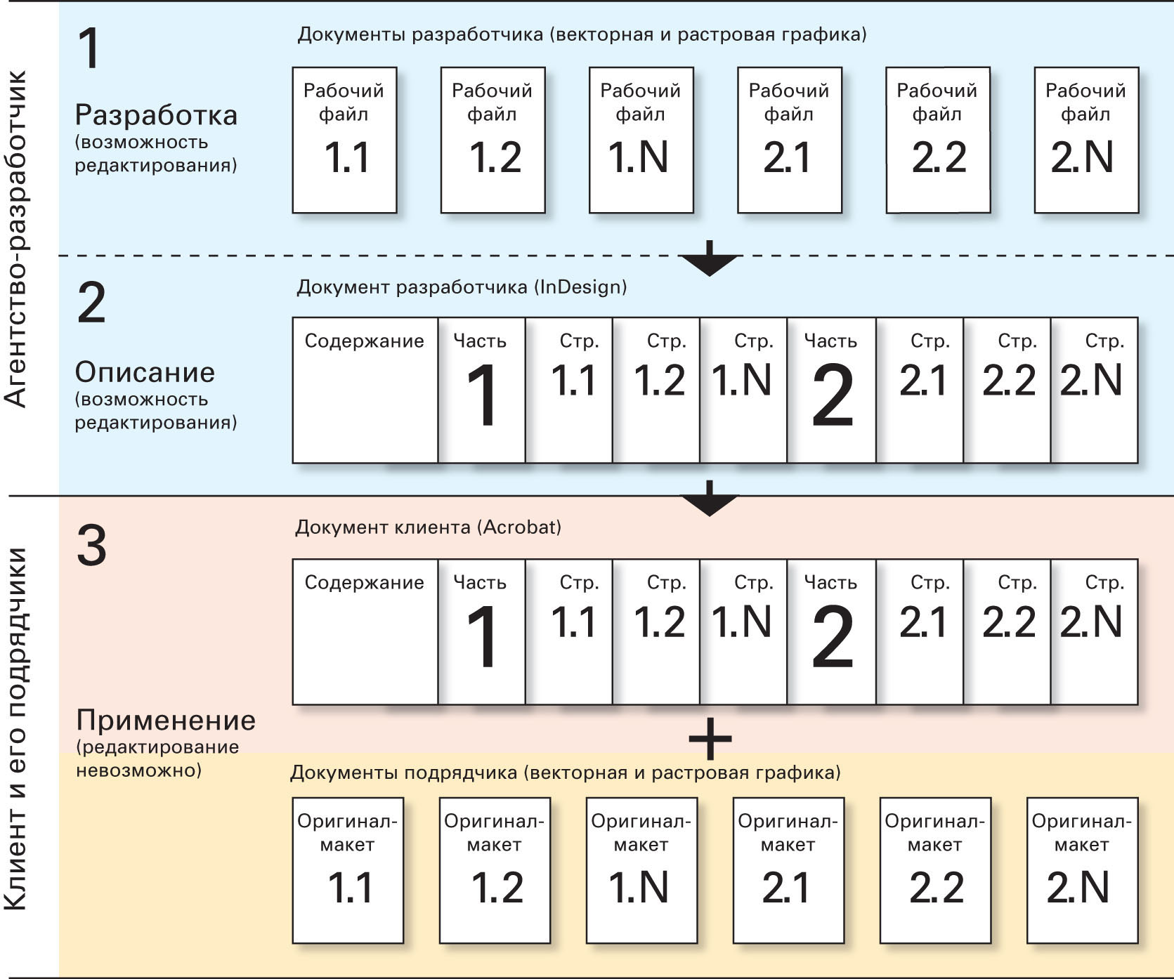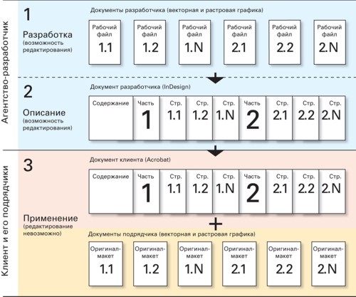 Эта схема представляет процесс в сильно упрощенном виде, но главное в ней то, что, для того чтобы внести любое (даже незначительное) изменение в конечные файлы, предназначенные подрядчику, необходимо пройти всю цепочку с самого начала.